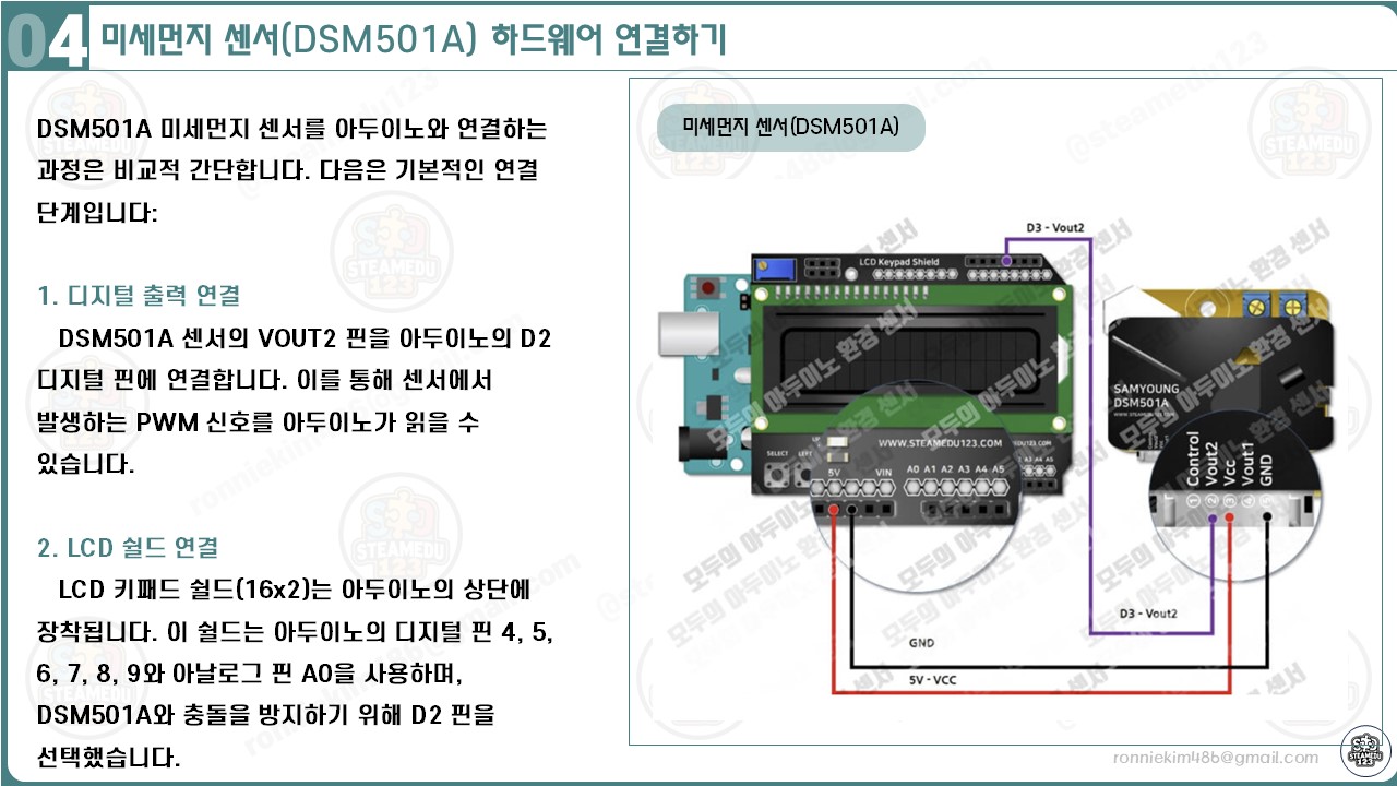 - DSM501A의 VOUT2 핀을 아두이노의 디지털 핀 D2에 연결하여 신호를 읽고, LCD를 통해 데이터를 표시합니다.