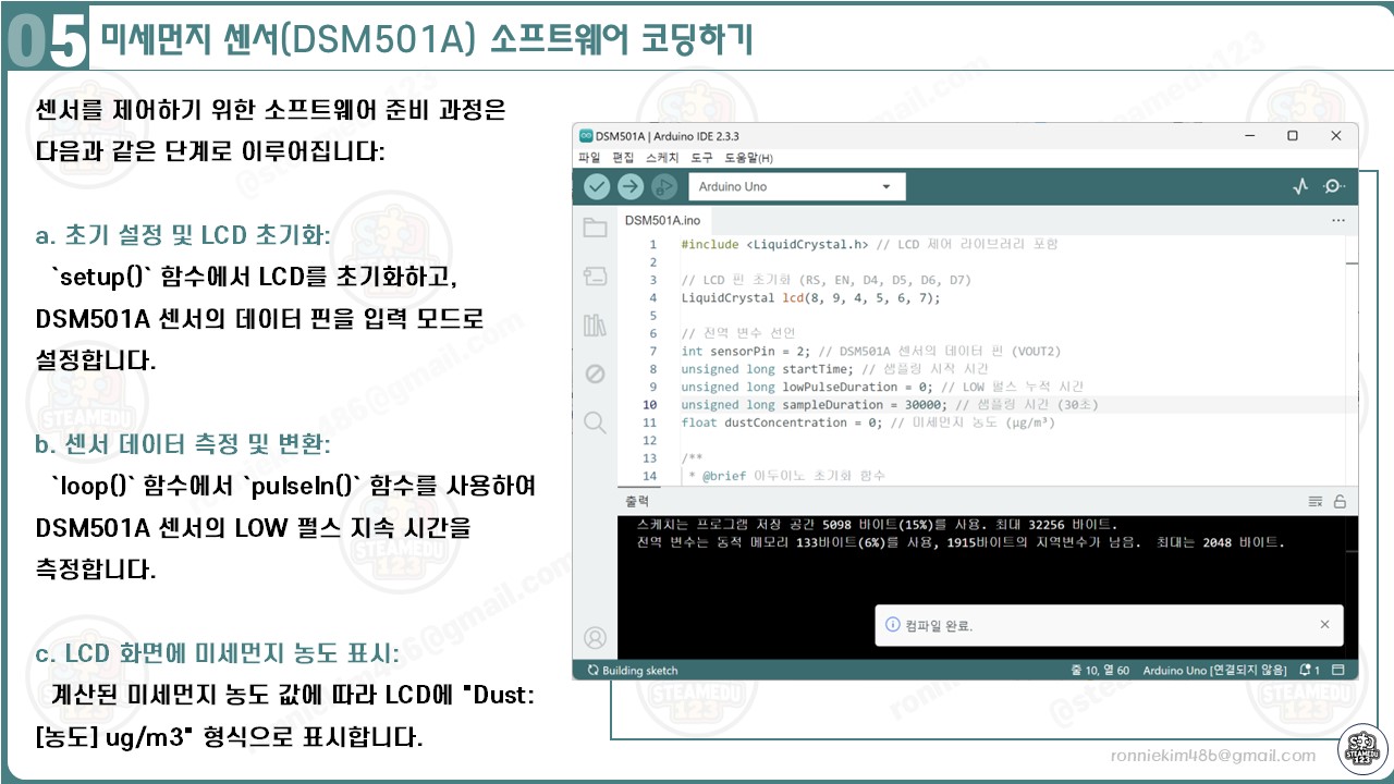 - 코드 수정: DSM501A 센서의 출력 핀을 변경했다면, 코드 내에서 해당 핀 번호를 수정해야 합니다.