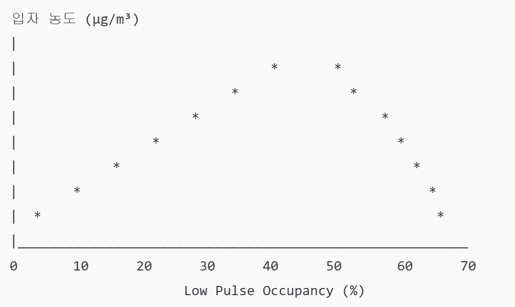 그래프는 Low Pulse Occupancy(LPO)와 입자 농도(농도 µg/m³) 간의 관계를 보여줍니다.