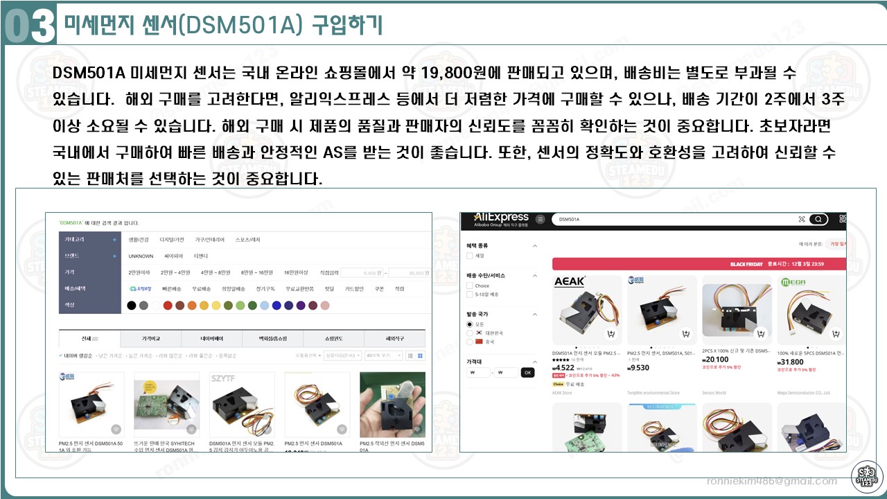 DSM501A 미세먼지 센서는 국내 온라인 쇼핑몰에서 약 19,800원에 판매되고 있으며, 배송비는 별도로 부과될 수 있습니다. 해외 구매를 고려한다면, 알리익스프레스 등에서 더 저렴한 가격에 구매할 수 있으나, 배송 기간이 2주에서 3주 이상 소요될 수 있습니다. 해외 구매 시 제품의 품질과 판매자의 신뢰도를 꼼꼼히 확인하는 것이 중요합니다. 초보자라면 국내에서 구매하여 빠른 배송과 안정적인 AS를 받는 것이 좋습니다. 또한, 센서의 정확도와 호환성을 고려하여 신뢰할 수 있는 판매처를 선택하는 것이 중요합니다
