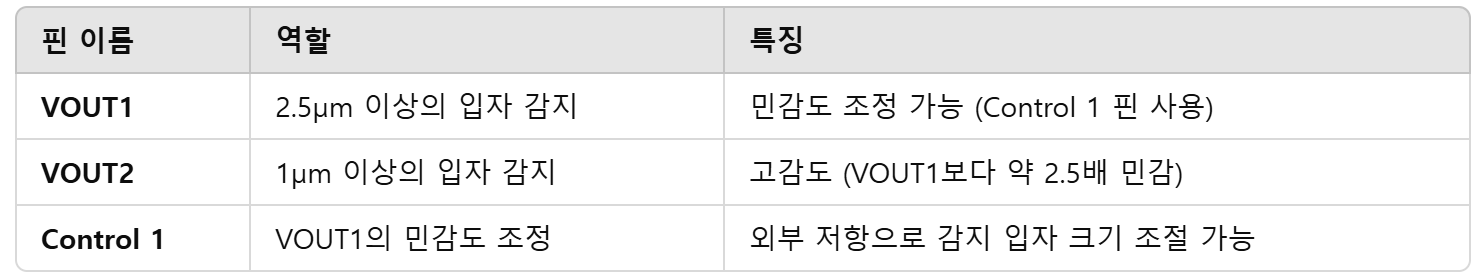 - VOUT2에 비해 **감도가 낮으며, 더 큰 입자(2.5µm 이상)**를 감지하도록 설정되어 있습니다.