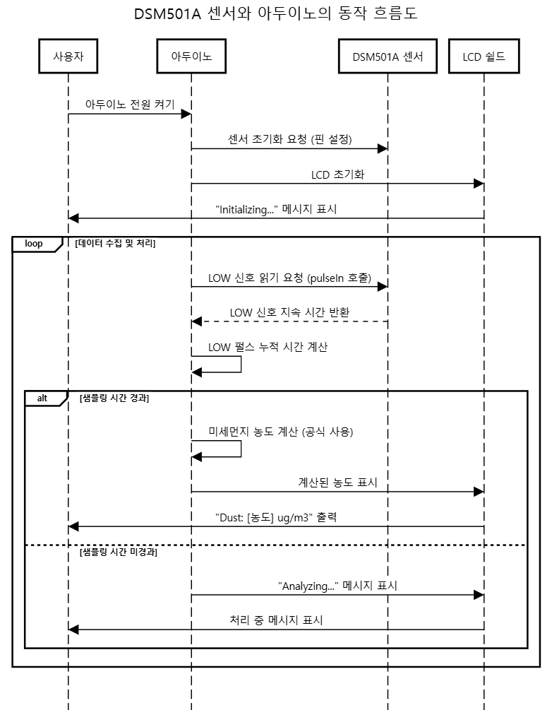 이 동작 순서는 미세먼지 센서 데이터를 실시간으로 수집, 처리, 표시하기 위해 설계되었으며, 사용자 친화적인 환경에서 안정적으로 작동할 수 있도록 구성되었습니다.