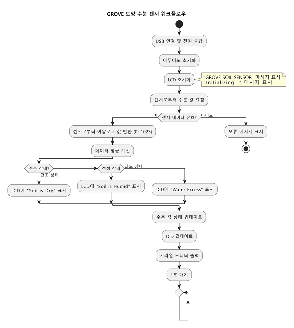 아두이노 보드에 전원을 공급하면 LCD 화면에 초기화 메시지가 나타납니다. 예를 들어, "GROVE SOIL SENSOR"와 "Initializing..." 등의 문구가 표시되며, 이는 시스템이 정상적으로 시작되었음을 의미합니다. - 센서 값 측정 및 표시