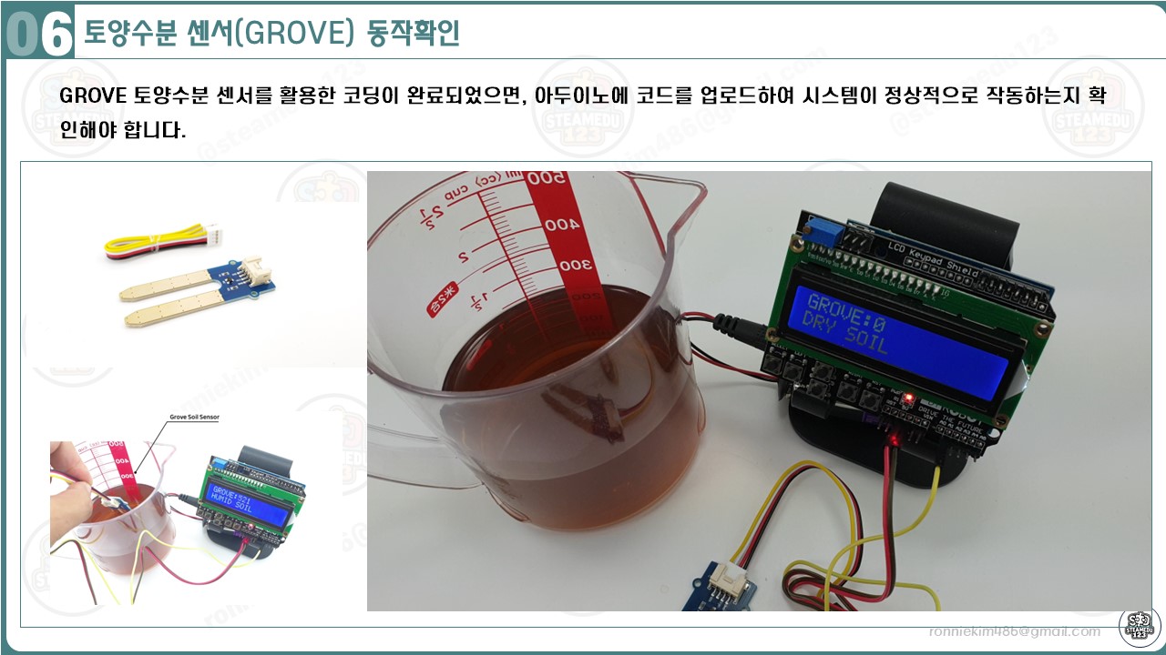 아두이노와 GROVE 토양수분 센서, 그리고 LCD 쉴드의 하드웨어 연결과 소프트웨어 코딩이 완료되었다면, 이제 시스템이 올바르게 작동하는지 확인해야 합니다. 다음 단계에 따라 동작을 검증해보세요: