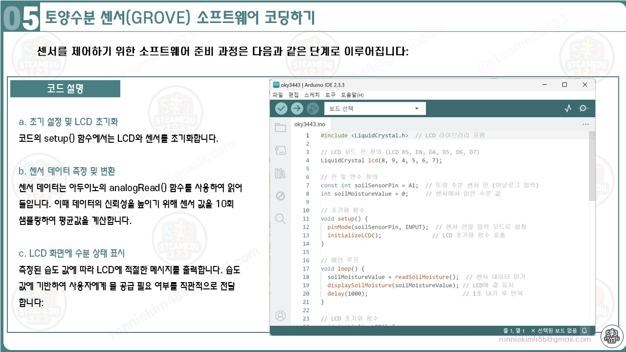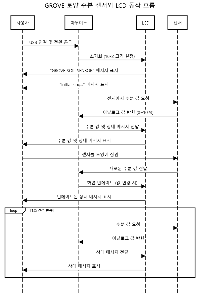 이 코드는 아두이노, LCD 쉴드(16x2), 그리고 SEEED GROVE 토양 수분 센서를 활용하여 토양의 수분 상태를 측정하고 LCD 화면에 결과를 출력합니다. 아래는 동작 순서를 단계별로 설명한 내용입니다.