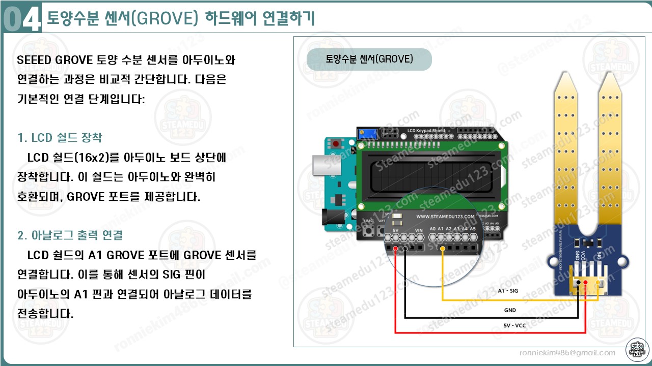 이번 단계에서는 아두이노와 LCD 쉴드(16x2), 그리고 SEEED GROVE 토양 수분 센서를 연결하는 방법을 알아보겠습니다. 이 구성에서는 LCD 쉴드의 A1 포트를 통해 센서의 SIG 핀을 연결합니다. GROVE 시스템은 플러그 앤 플레이 방식을 지원하여 초보자도 쉽게 하드웨어를 연결할 수 있습니다.