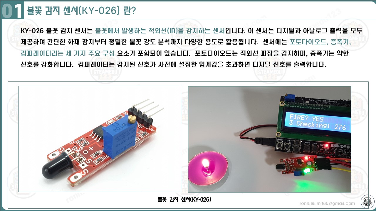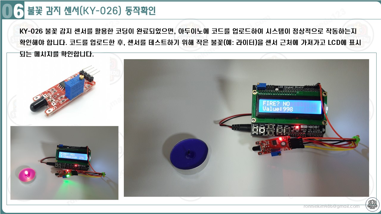 - 사용 방법: 센서를 아두이노와 LCD 쉴드에 연결하고, 센서 데이터를 읽어 불꽃 강도를 실시간으로 모니터링합니다.