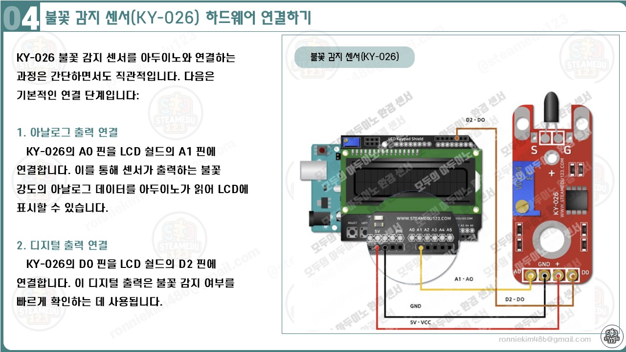 - 핀 위치 확인: KY-026 센서와 LCD 쉴드의 핀 번호를 정확히 확인한 후 연결합니다.