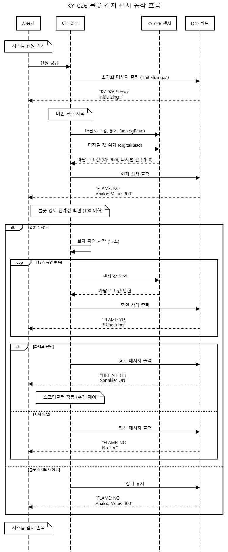 이 연결 구성을 통해 KY-026 센서가 감지한 불꽃 데이터를 LCD 쉴드에 실시간으로 출력할 수 있습니다. 이렇게 구성된 시스템은 간단하면서도 신뢰성 있는 화재 감지 경고 시스템을 구현할 수 있습니다.