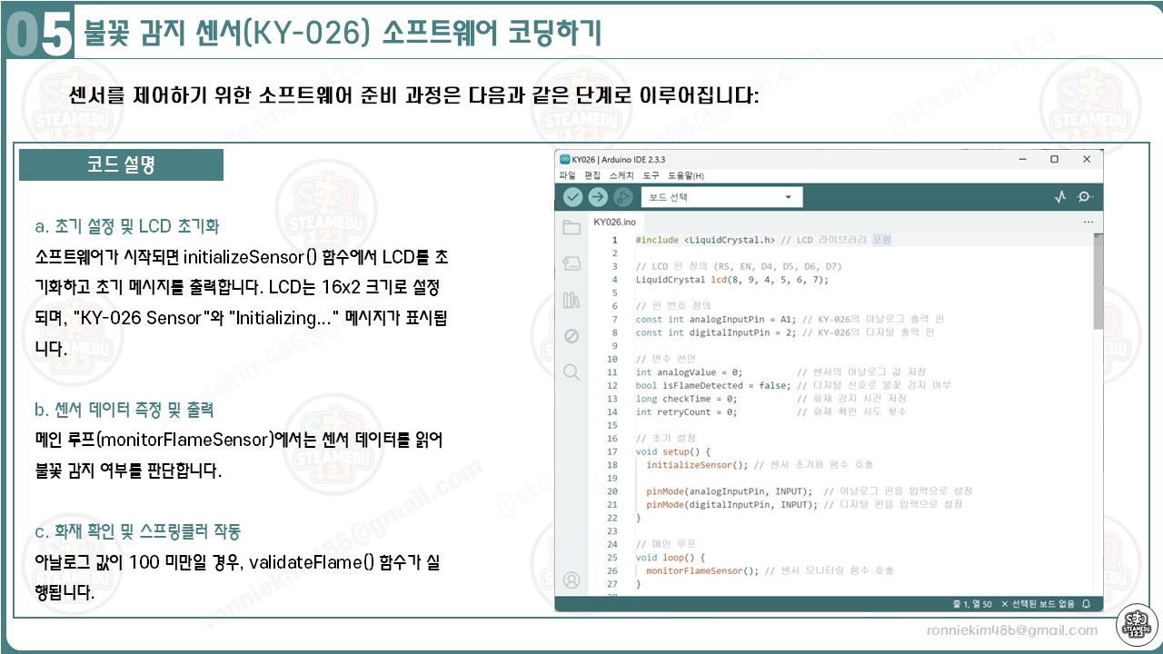 이 코드는 아두이노, LCD 쉴드(16x2), KY-026 센서를 기반으로 불꽃 감지를 구현하며, 다음과 같은 순서로 동작합니다