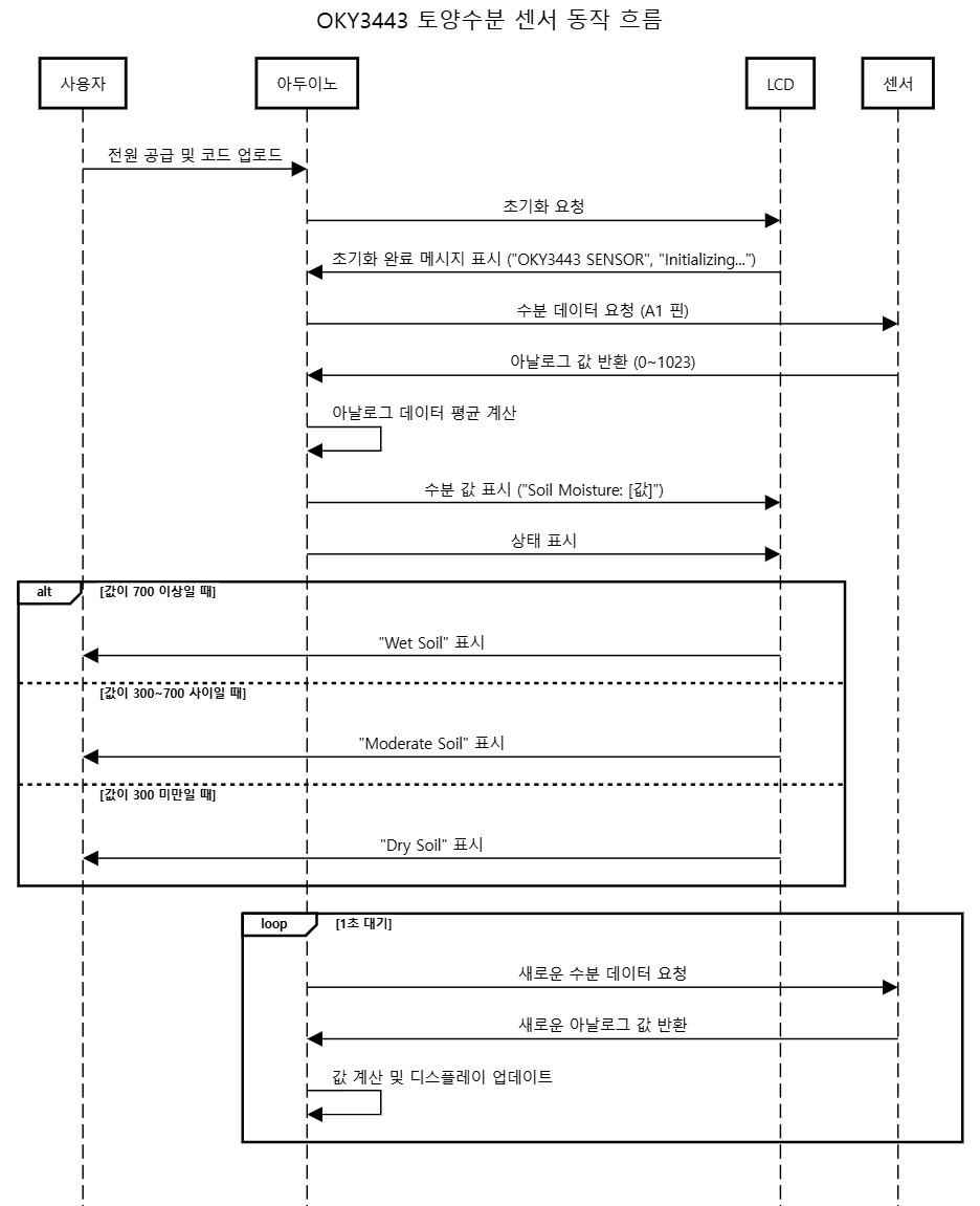 이 동작 순서를 통해 센서 데이터 측정과 LCD 출력이 효율적으로 이루어지며, 프로젝트의 주요 목표인 토양 수분 상태 실시간 모니터링이 구현됩니다.