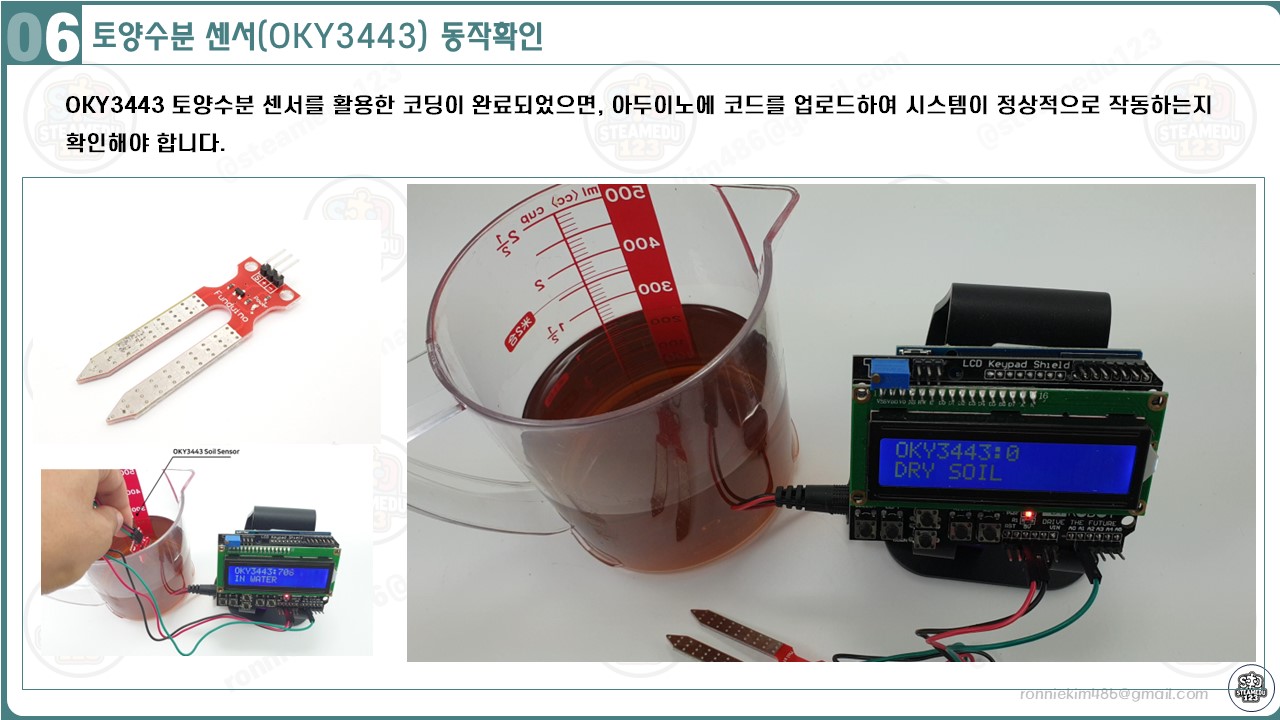 OKY3443 토양수분 센서와 아두이노, LCD 쉴드를 연결하고 코드를 업로드한 후, 시스템이 올바르게 작동하는지 확인하는 과정은 다음과 같습니다:
