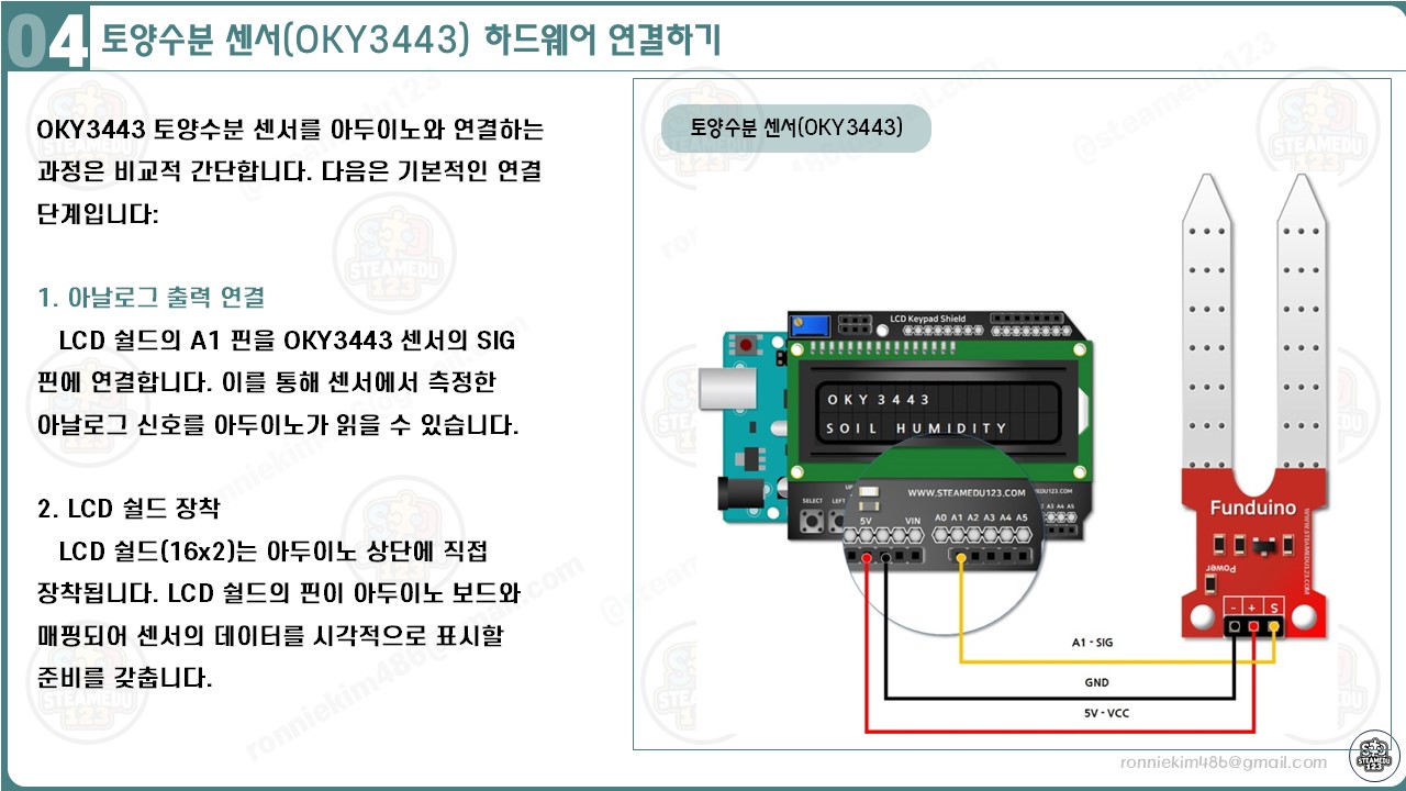 이 프로젝트에서는 아두이노와 OKY3443 토양수분 센서, 그리고 16x2 LCD 쉴드를 사용하여 토양의 수분 상태를 모니터링합니다. LCD 쉴드는 데이터를 시각적으로 표시하며, 센서는 아날로그 값으로 토양의 수분 상태를 전달합니다. 아래는 하드웨어 연결 방법과 그 이유를 구체적으로 설명합니다.