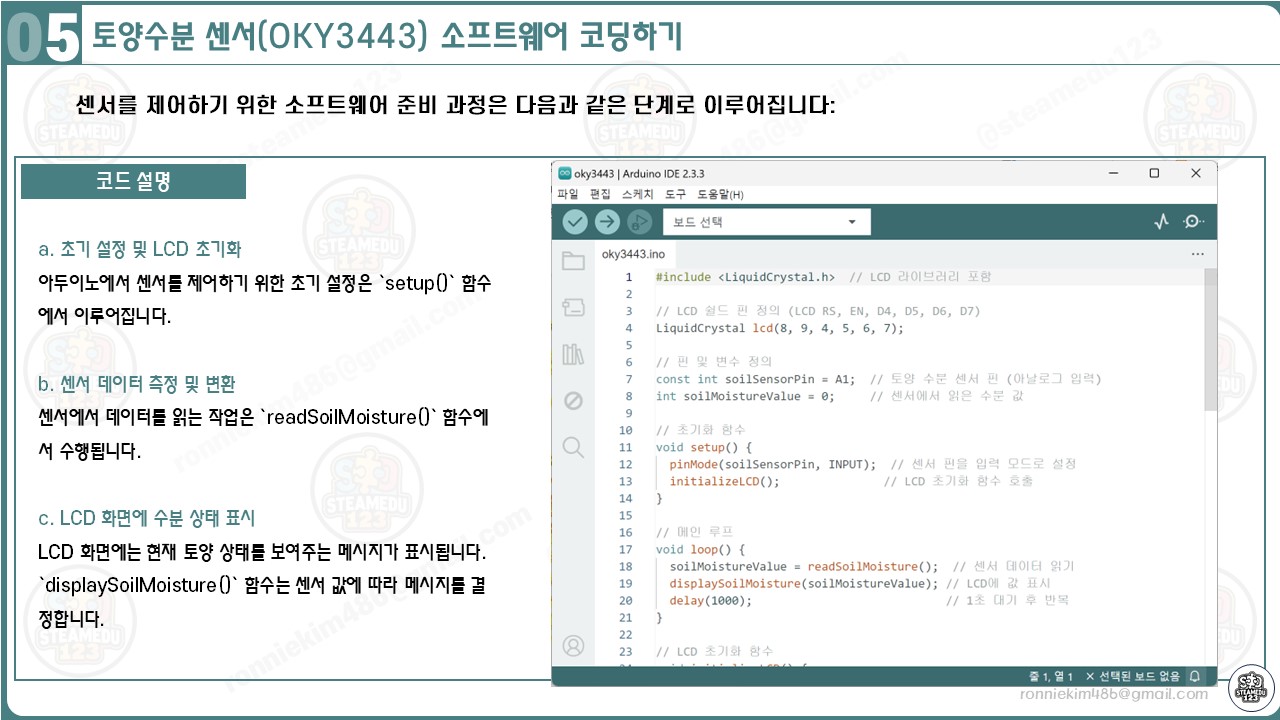OKY3443 토양수분 센서와 아두이노, LCD 쉴드를 활용하여 토양의 수분 상태를 실시간으로 모니터링하는 시스템을 구축하였습니다. 이 프로젝트를 통해 다음과 같은 경험을 얻을 수 있습니다: