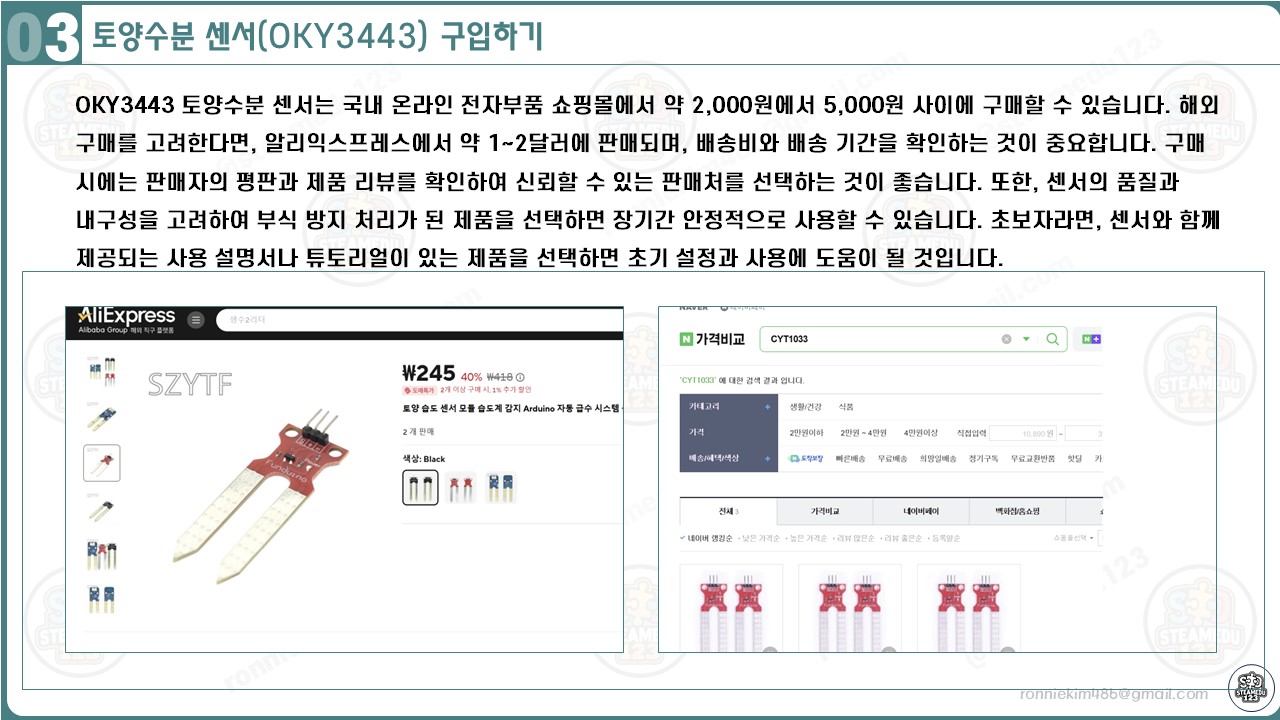 OKY3443 토양수분 센서는 국내 온라인 전자부품 쇼핑몰에서 약 2,000원에서 5,000원 사이에 구매할 수 있습니다. 해외 구매를 고려한다면, 알리익스프레스에서 약 1~2달러에 판매되며, 배송비와 배송 기간을 확인하는 것이 중요합니다. 구매 시에는 판매자의 평판과 제품 리뷰를 확인하여 신뢰할 수 있는 판매처를 선택하는 것이 좋습니다. 또한, 센서의 품질과 내구성을 고려하여 부식 방지 처리가 된 제품을 선택하면 장기간 안정적으로 사용할 수 있습니다. 초보자라면, 센서와 함께 제공되는 사용 설명서나 튜토리얼이 있는 제품을 선택하면 초기 설정과 사용에 도움이 될 것입니다.