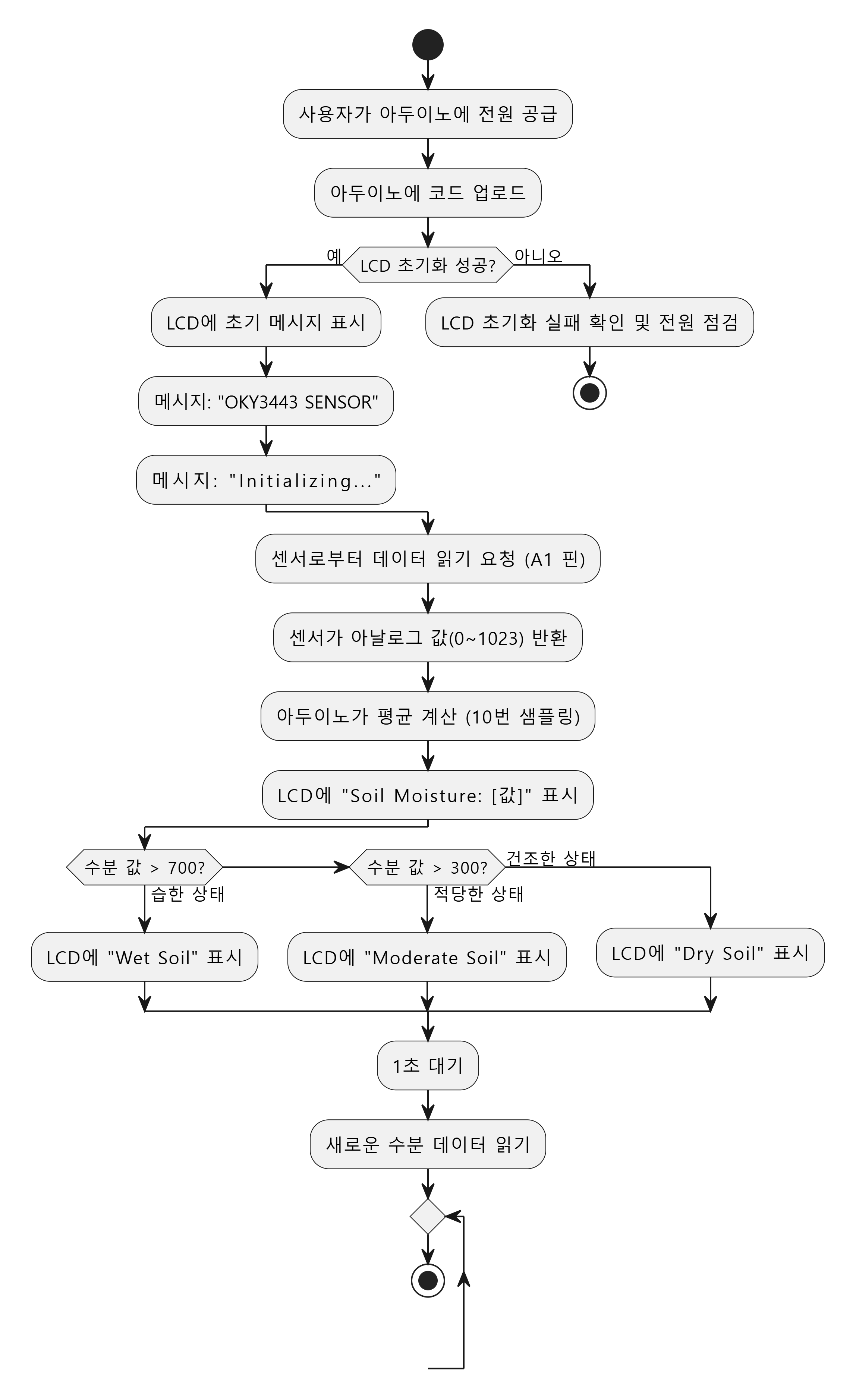 이 동작 순서를 통해 센서 데이터 측정과 LCD 출력이 효율적으로 이루어지며, 프로젝트의 주요 목표인 토양 수분 상태 실시간 모니터링이 구현됩니다.