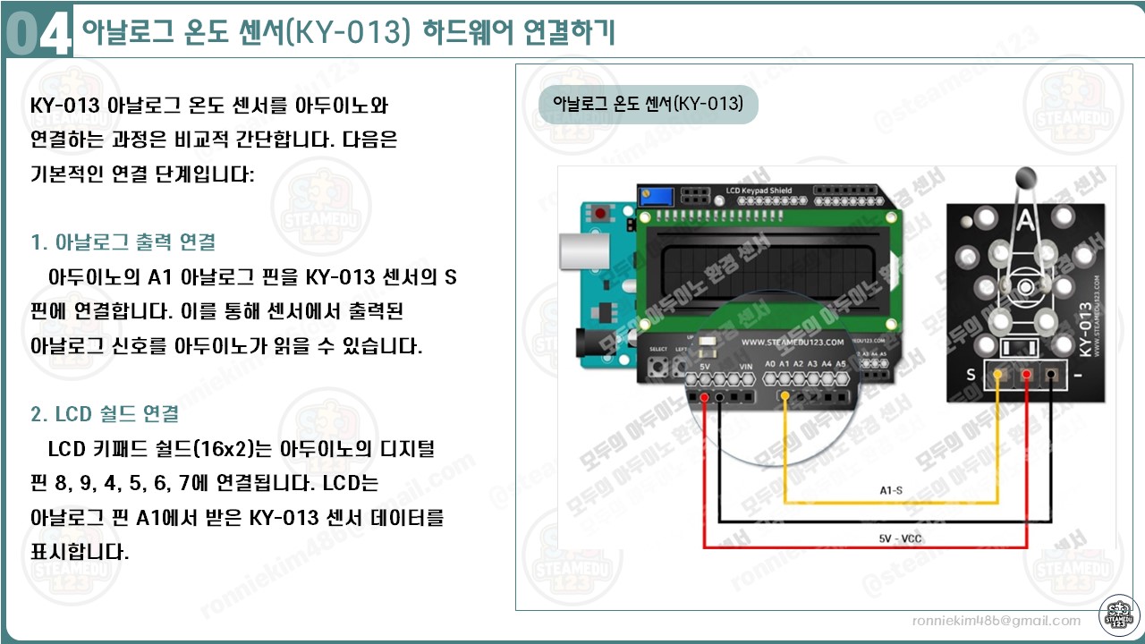 - 신호(S) 핀 연결 이유: KY-013 센서는 온도에 따라 아날로그 신호를 출력합니다. 이 신호를 아두이노가 읽기 위해서는 아날로그 입력 핀에 연결해야 합니다. LCD 키패드 쉴드의 A1 핀은 이러한 아날로그 신호를 수신하는 역할을 합니다.