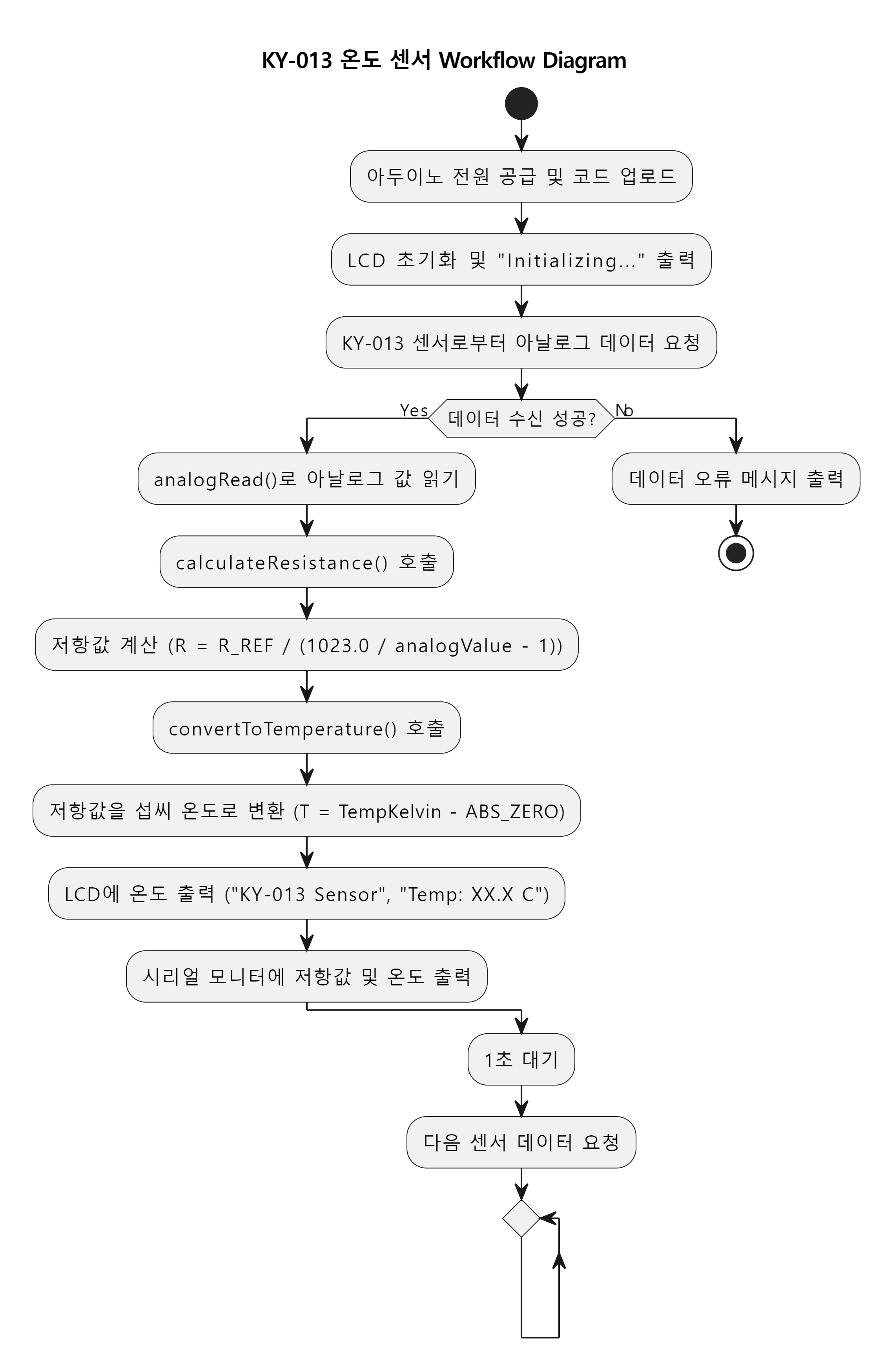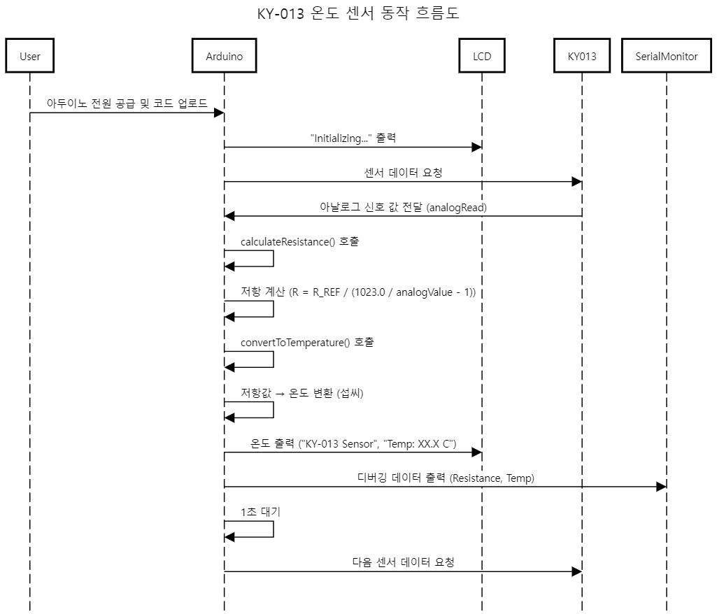 이 구조는 실시간 데이터 수집 및 디스플레이를 간단하고 명확하게 구현하며, KY-013 센서와 LCD 쉴드를 통해 온도 측정 결과를 직관적으로 제공하는 시스템을 구성합니다.