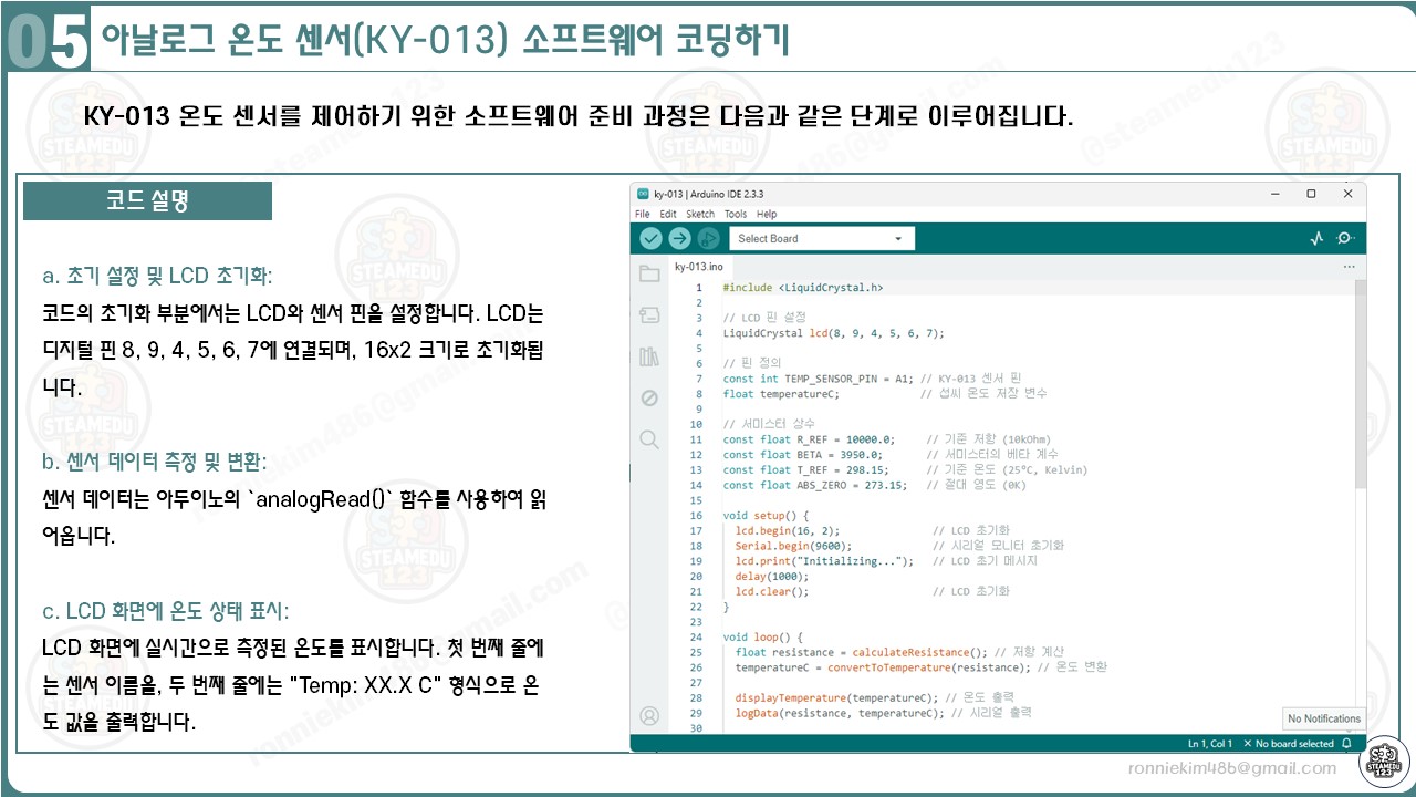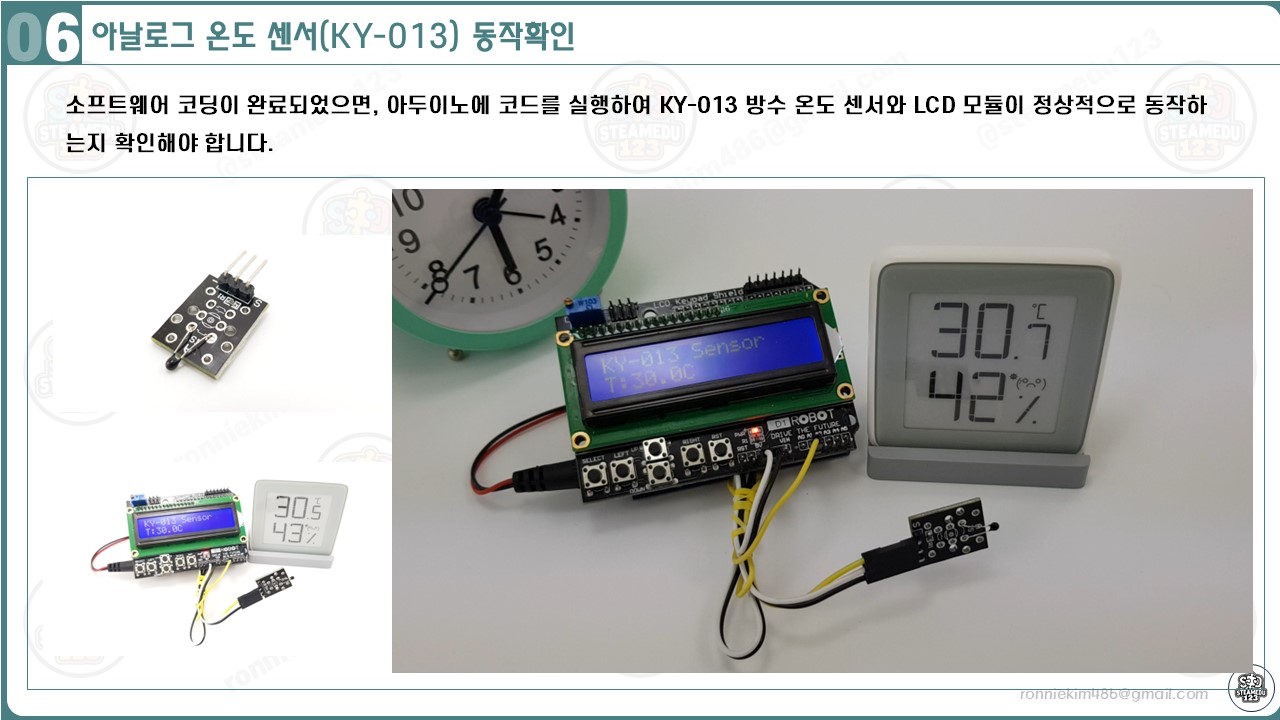 이러한 연결 방식을 통해 아두이노는 KY-013 센서로부터 온도 데이터를 받아 LCD에 표시할 수 있습니다.