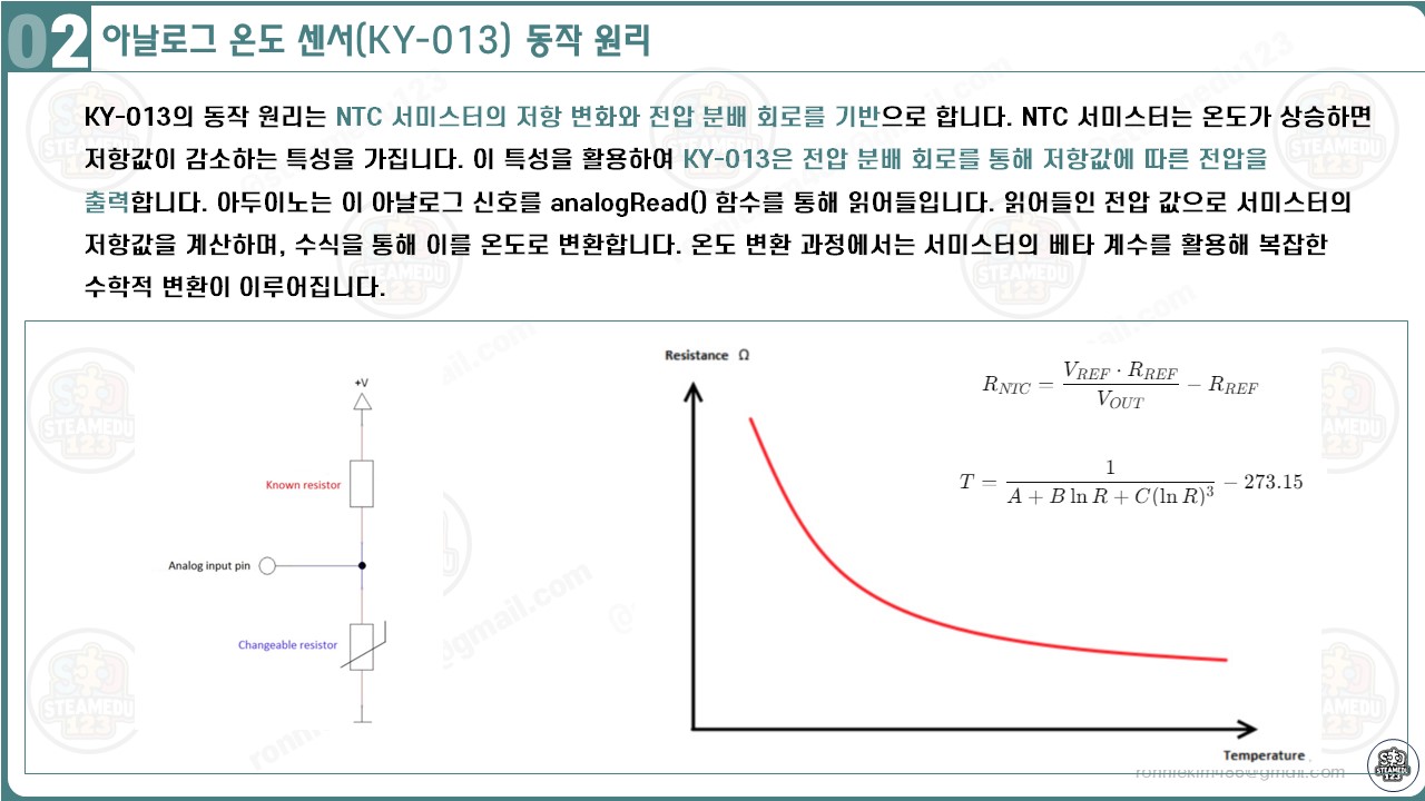 - KY-013 모듈은 전압 분배 회로를 통해 입력 전압을 두 저항(NTC 서미스터와 고정 저항) 사이에 나눕니다.