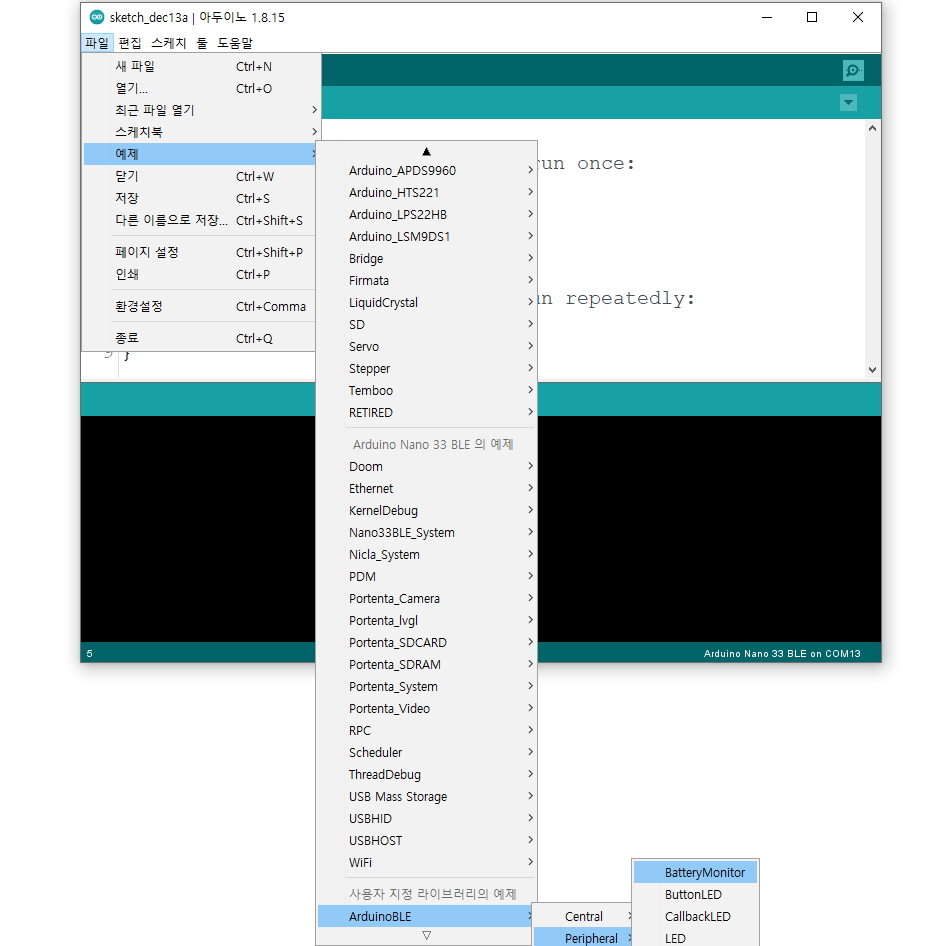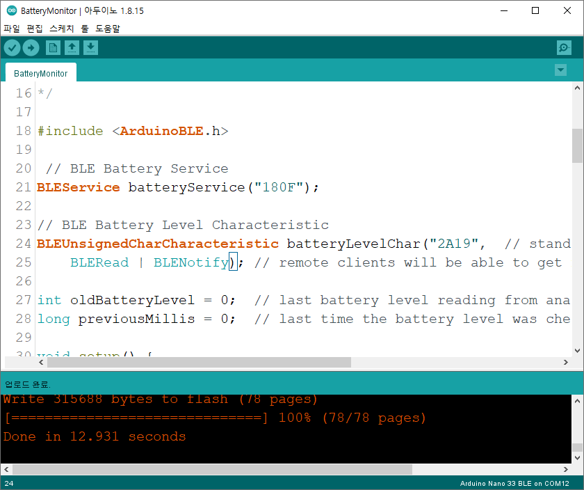 아두이노 IDE를 이용해 아두이노 Arduino BLE 예 1 – 배터리 잔량 표시기 소스코드를 로딩할 수 있다.
