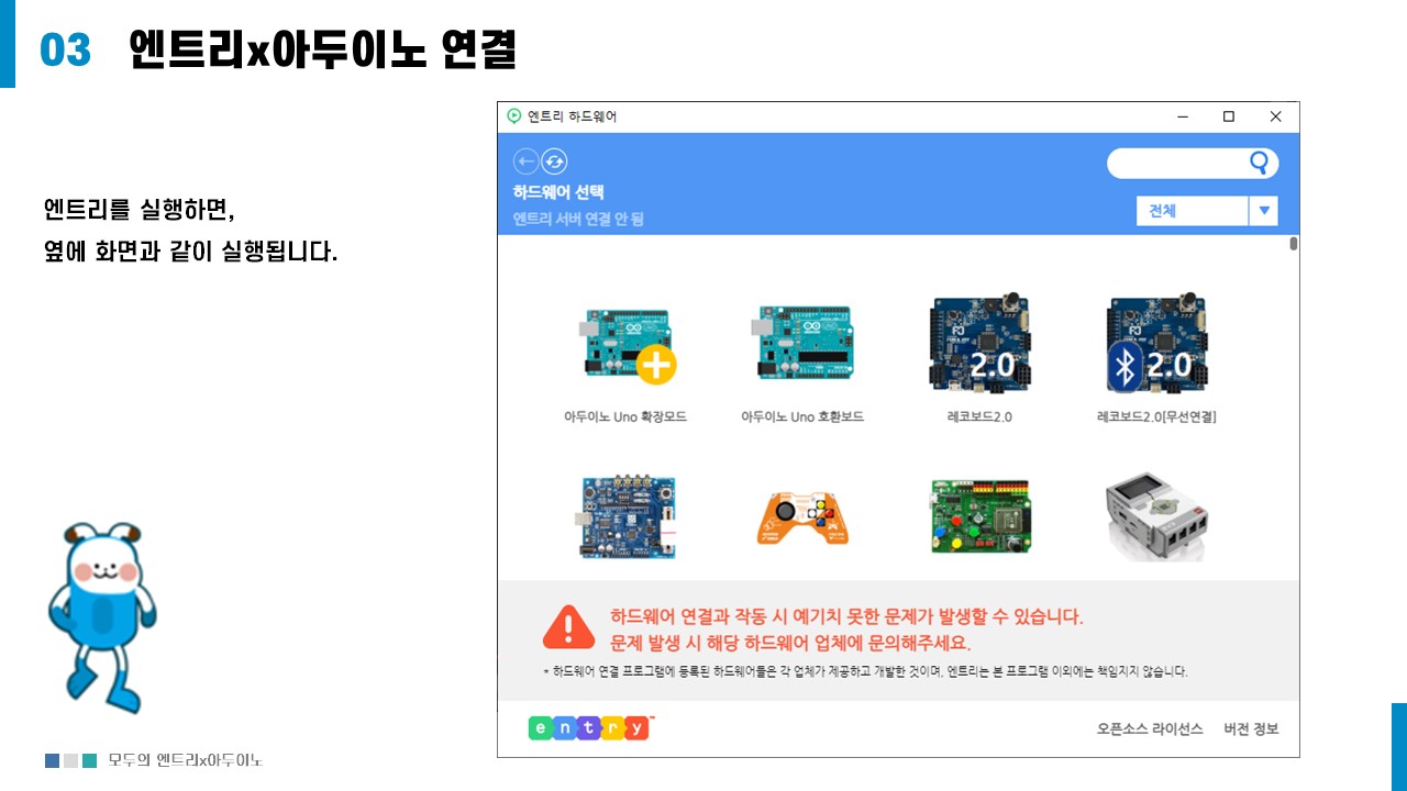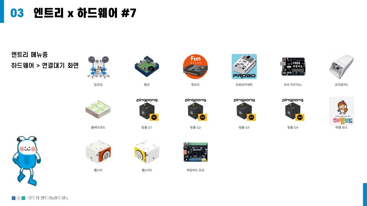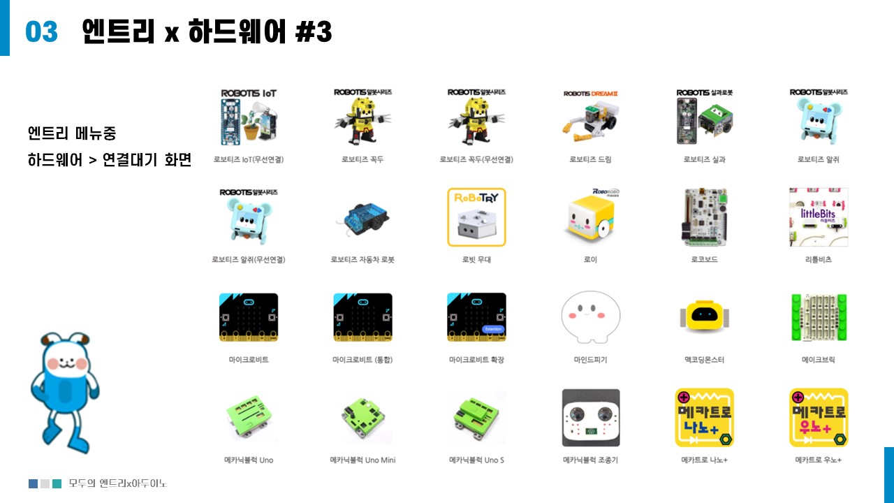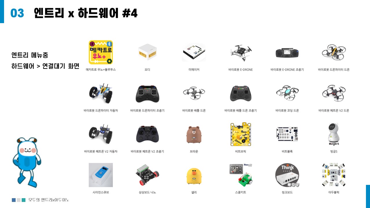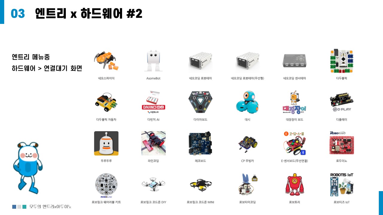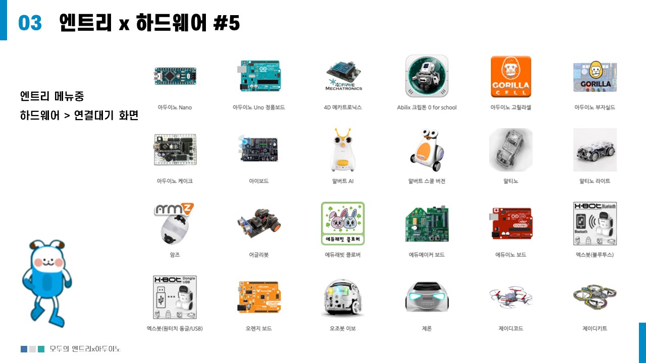 엔트리에서는 교육을 위해 다양한 하드웨어가 지원한다.