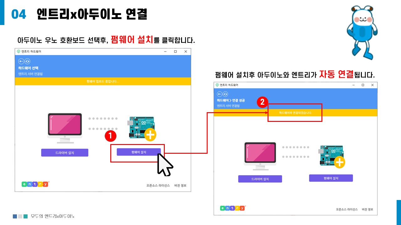 아두이노 우노 호환보드 선택후, 처음 연결하느 경우, 펌웨어 설치를 클릭하여 엔트리와 아두이노 연결을 준비한다.