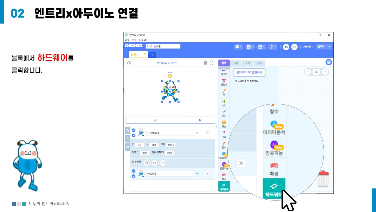 엔트리 화면중 블록에서 하드웨어를 클릭한다.