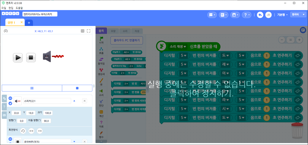 엔트리 블록 동작 뿐만 아니라, 아두이노로 직접 동작을 확인할 수 있다.