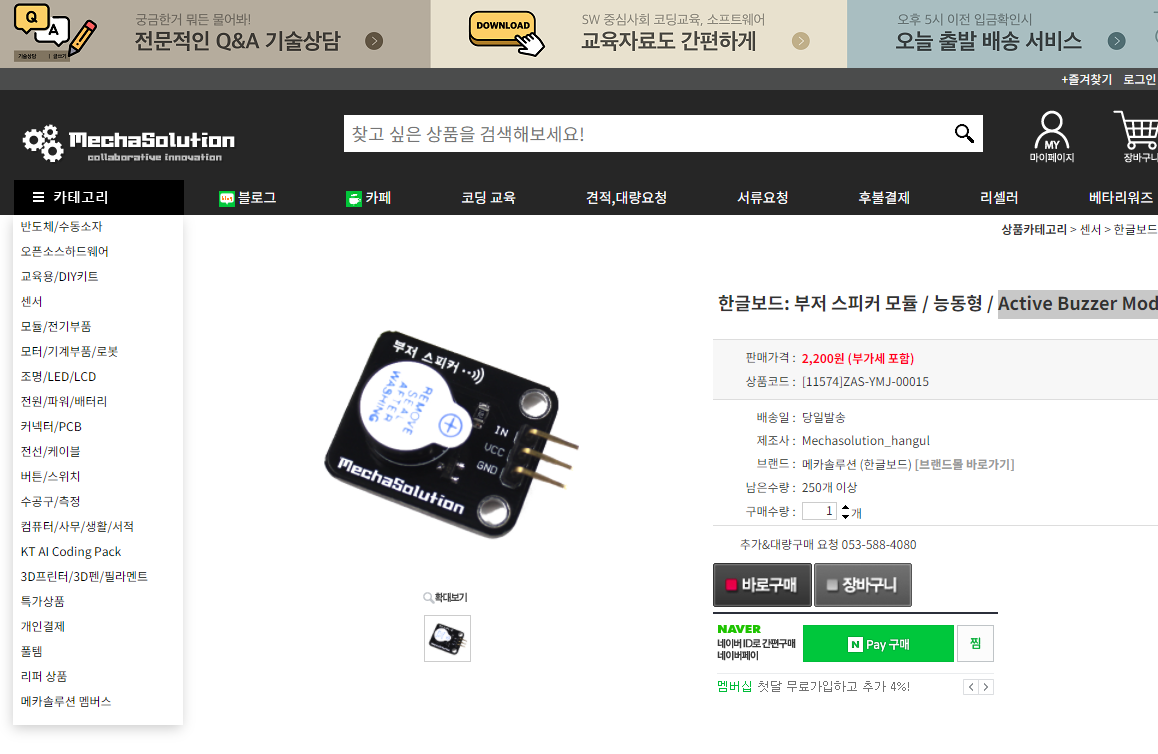 [부저 스피커 모듈 센서]는 메카솔루션, 알리익스프레스, 네이버 쇼핑몰, 아마존 등에서 센서를 구입할 수 있다