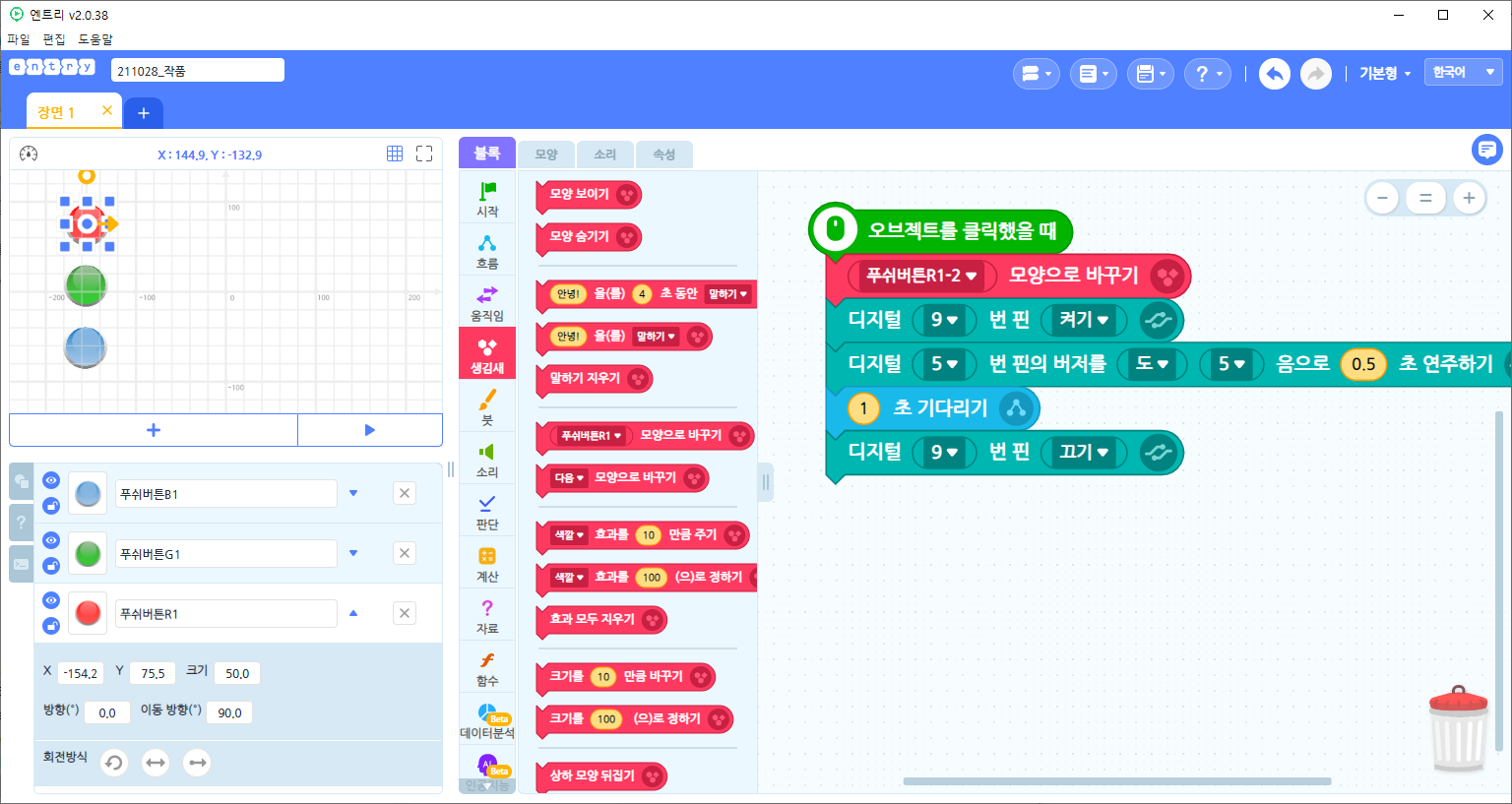 아두이노 부저, rgb led 를 이용해 엔트리 팝잇을 간단한 코딩 블럭으로 쉽게 실습할 수 있다.