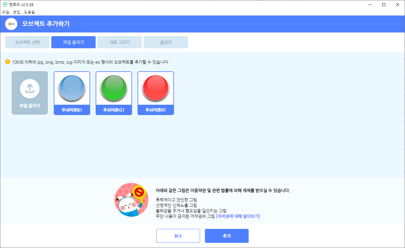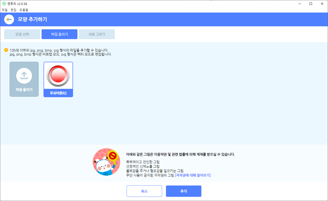 오브젝트 추가에서 파일 올리기로 버튼을 누르지 않은 상태의 이미지를 업로드합니다.