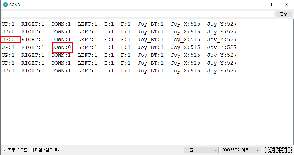 예를 들어, 조이스틱 상, 하로 움직이면, 기준값518, UP 1023, DOWN 0으로 표시된다.