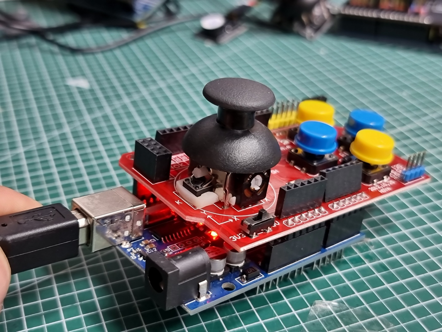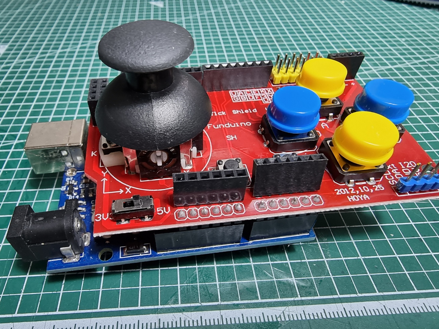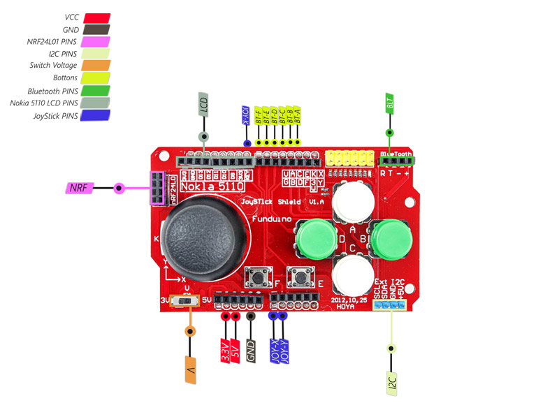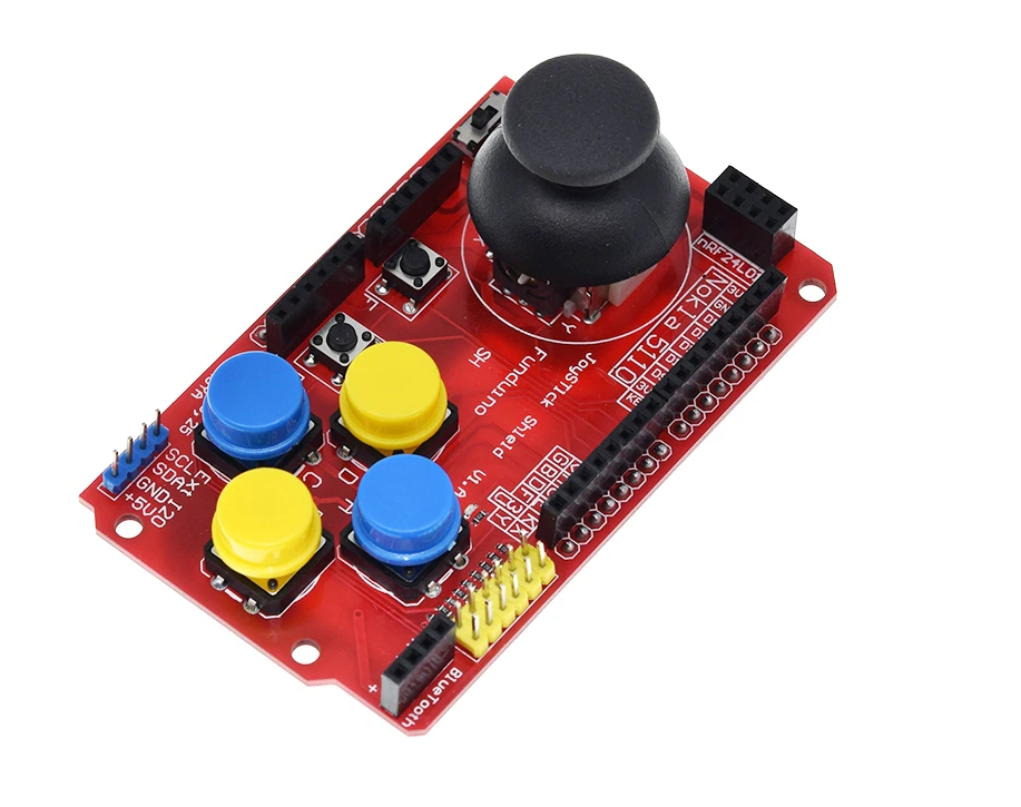 이중 축 조이스틱 실드는 로봇 및 게임 콘솔에 일반적으로 사용된다. 이 모듈에는 2축 조이스틱, 4개의 큰 버튼, 2개의 작은 버튼 및 다른 구성 요소에 연결하기 위한 여러 핀이 포함되어 있다.