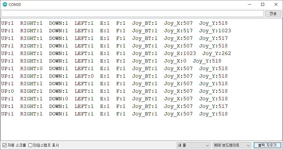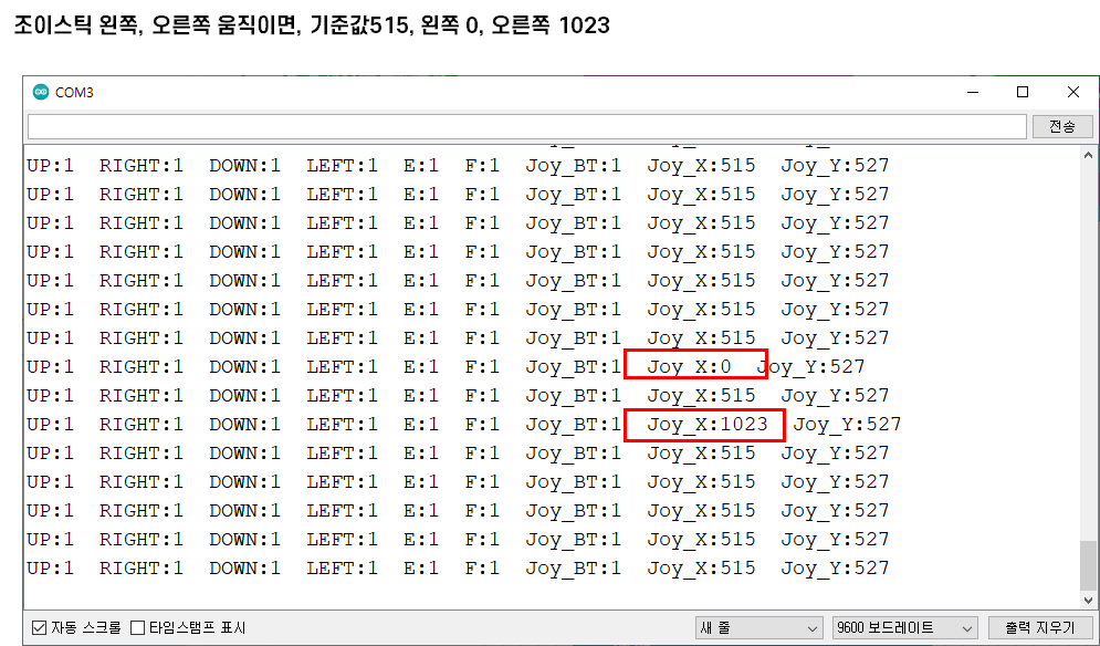 예를 들어, 조이스틱 왼쪽, 오른쪽 움직이면, 기준값 515, 왼쪽 0, 오른쪽 1023으로 표시된다.