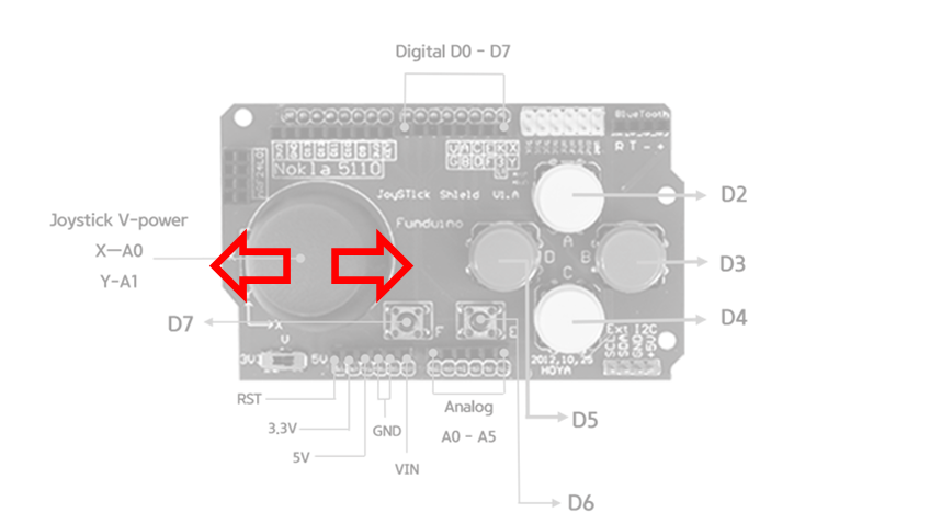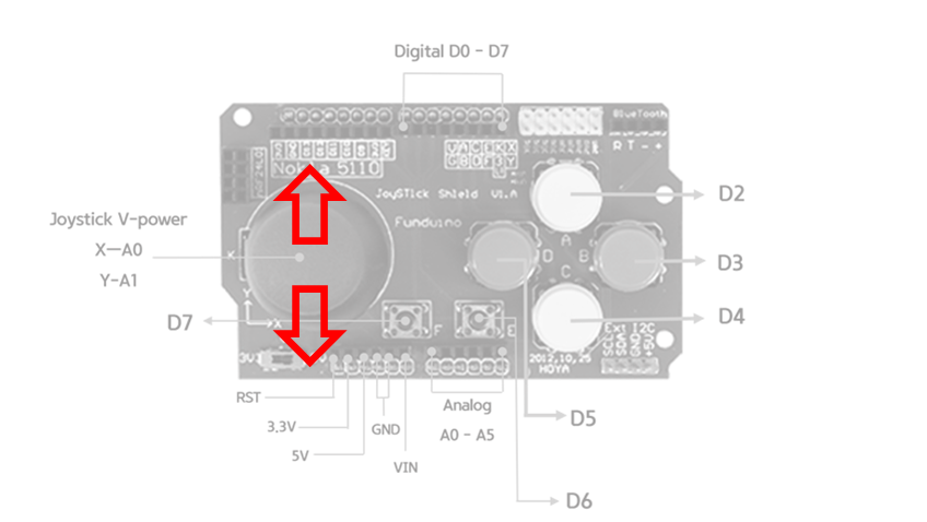 다음과 같이 아두이노와 적층으로 연결 할 수 있다. 조이스틱 쉴드에서 사용되는 핀은 D2, D3, D4, D5, D6, D7 을 사용한다.