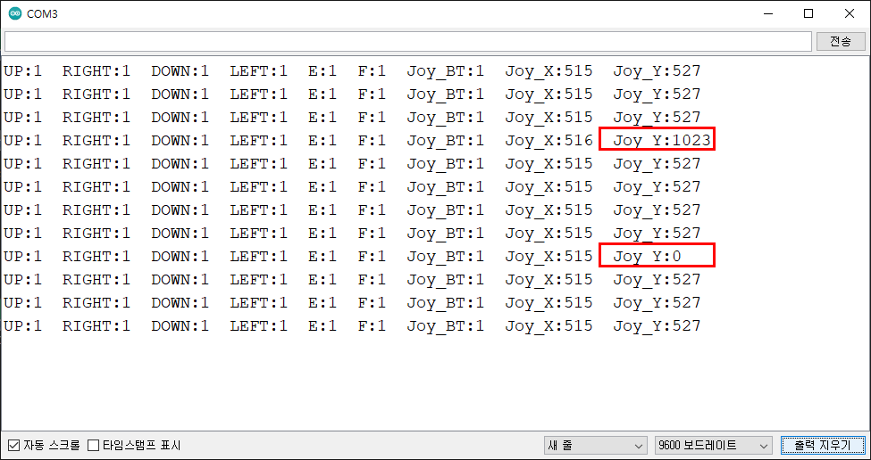 예를 들어, 조이스틱 상, 하로 움직이면, 기준값518, UP 1023, DOWN 0으로 표시된다.