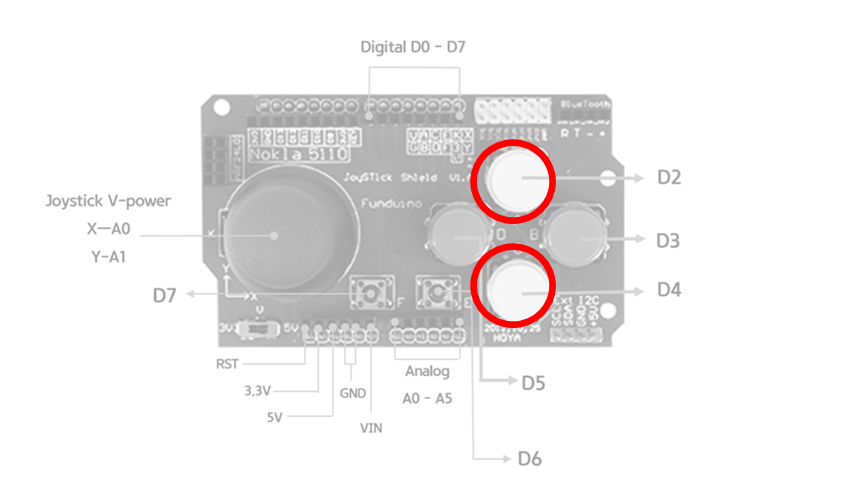 다음과 같이 아두이노와 적층으로 연결 할 수 있다. 조이스틱 쉴드에서 사용되는 핀은 D2, D3, D4, D5, D6, D7 을 사용한다.
