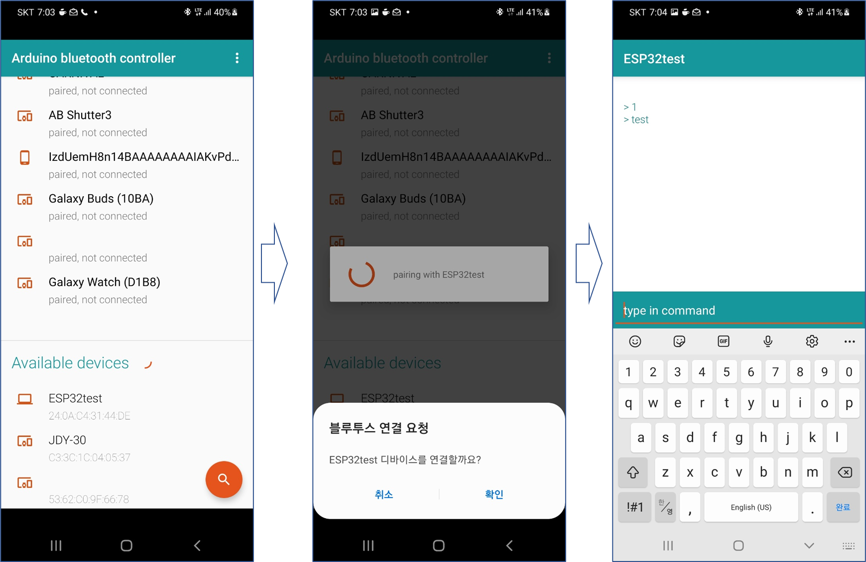 Bluetooth 장치에서 ESP32Test를 찾고 연결을 한다.