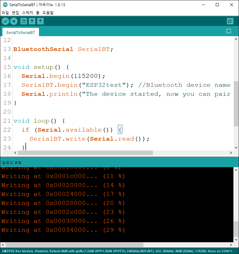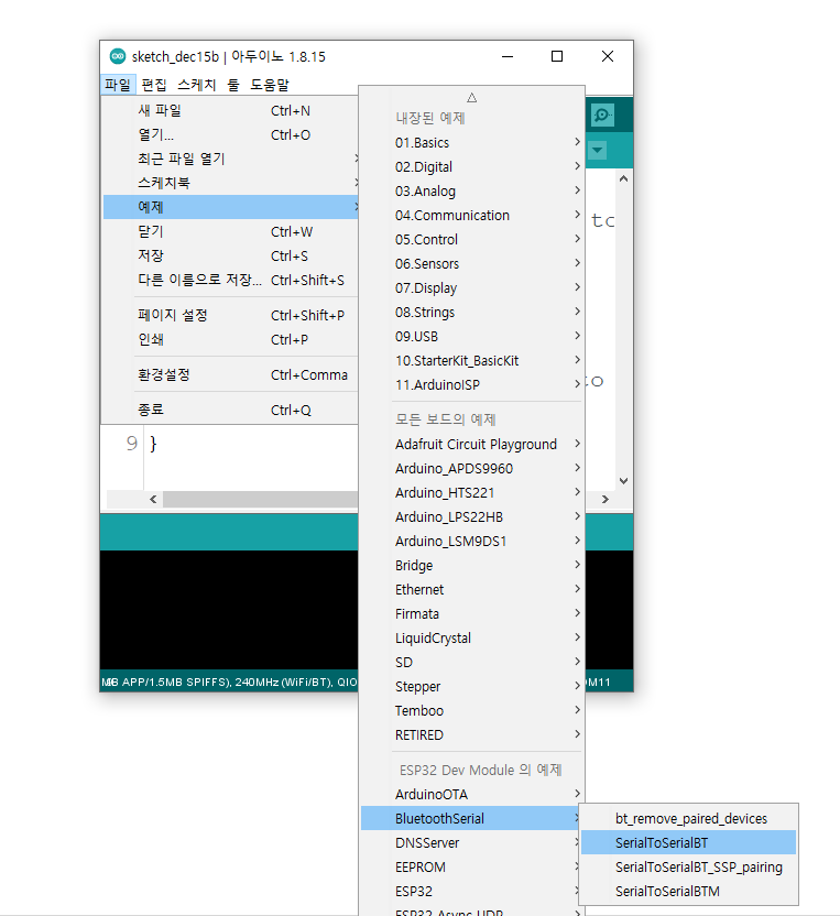 상단의 파일 – 예제 – BluetoothSerial – SerialToSerialBT순으로 예제를 실행한다.