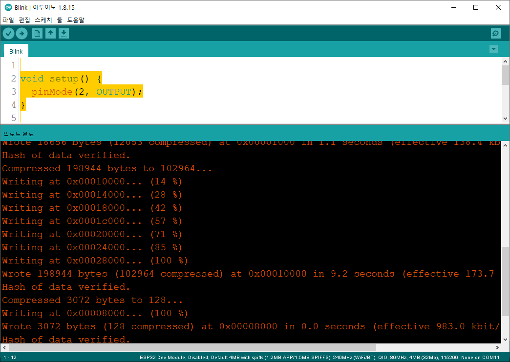 컴파일이 이상 없이 완료되면 스케치> 업로드(CTRL+U)를 선택해서 컴파일 파일을 업로드합니다.