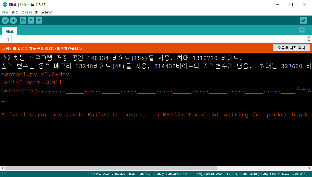 업로드가 안 되는 문제를 발생할 수 있습니다. A fatal error occurred: Failed to connect to ESP32: Timed out waiting for packet header