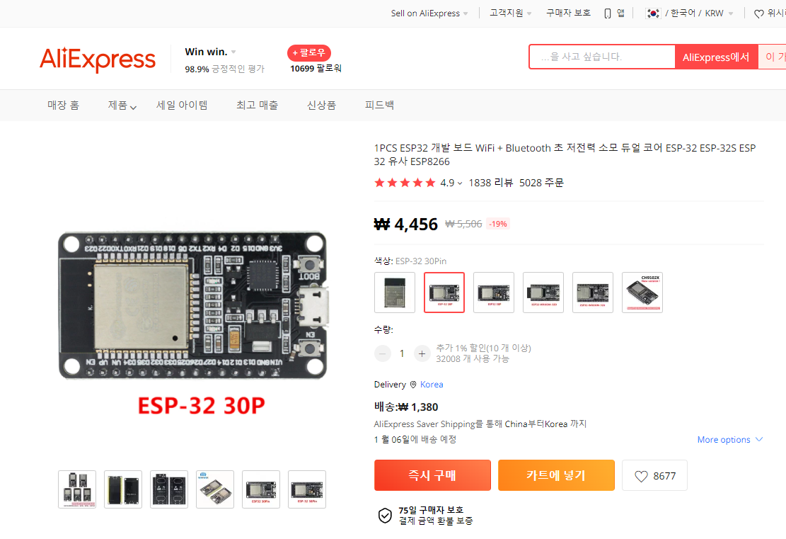 [ESP32 ]는 알리익스프레스, 네이버 쇼핑몰, 아마존 등에서 센서를 구입할 수 있습니다. ESP32는 30핀, 38핀 등 핀 배열, 종류 등 다양하게 판매되고 있습니다.