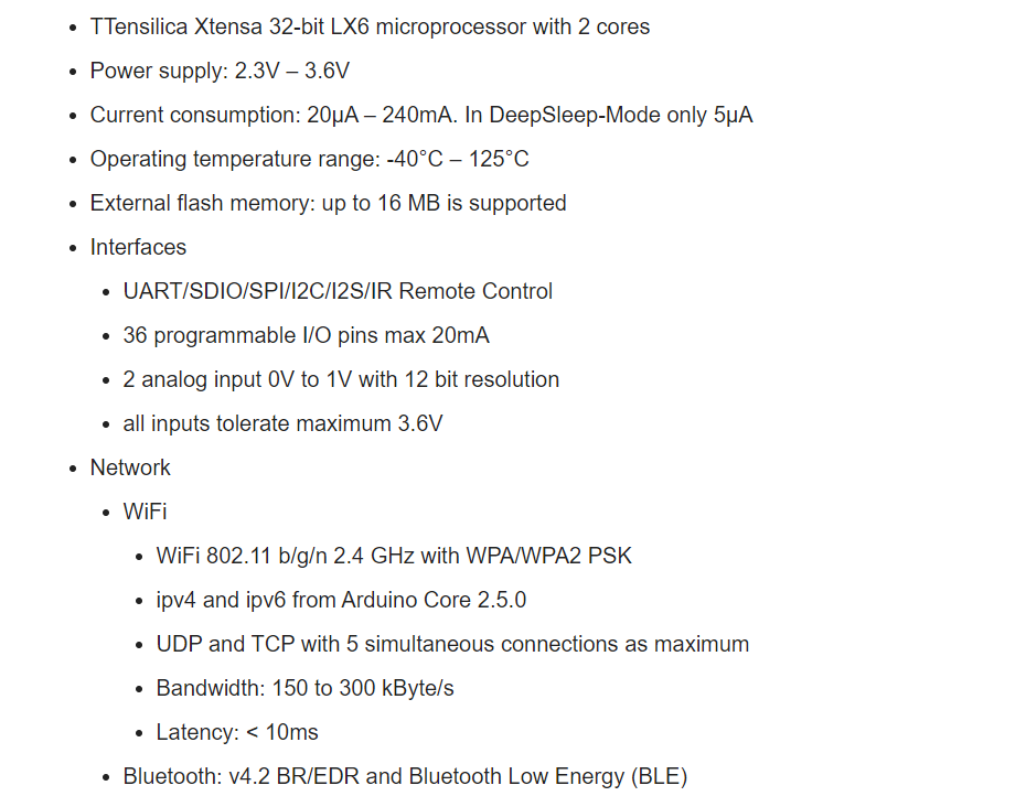 이 칩은 두 개의 Tensilica Xtensa LX6 마이크로프로세서 코어를 갖추고 있으며, 최대 240MHz에서 작동합니다. ESP3는 520KB의 SRAM을 제공하며, 외부 스파이럼(SPIRAM)을 추가하여 최대 4MB의 RAM까지 확장할 수 있습니다.