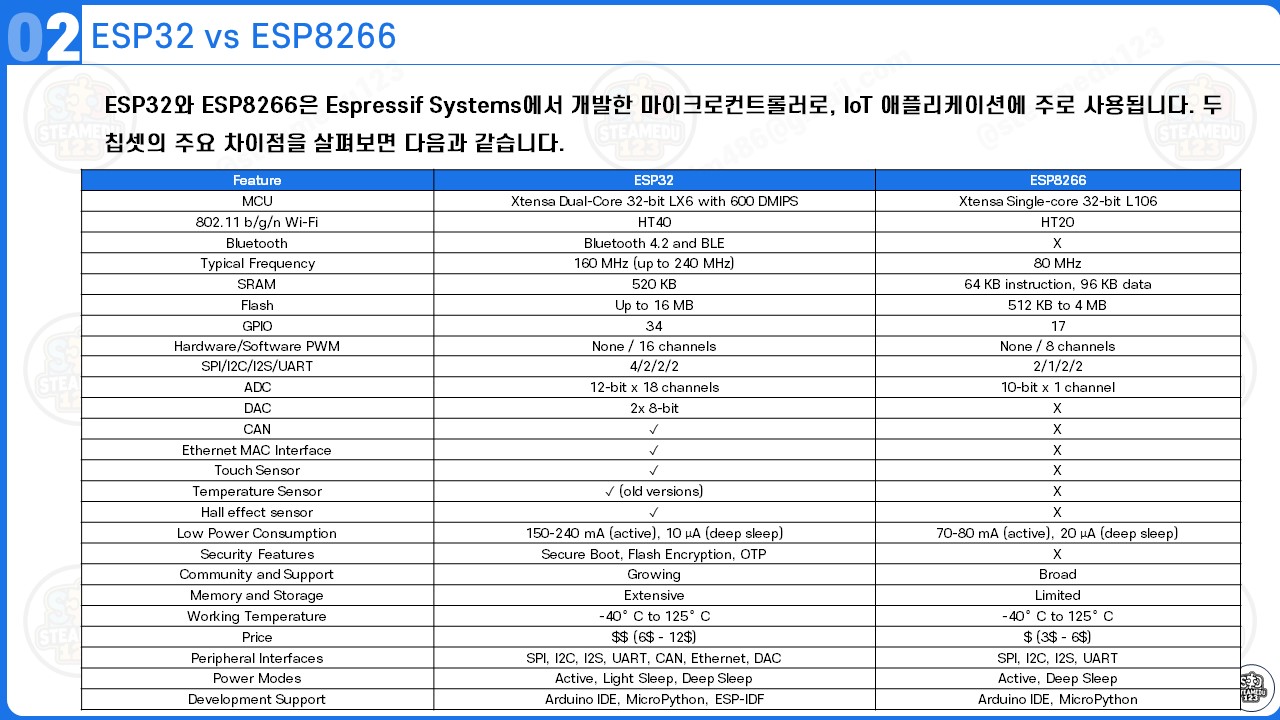 - ESP32는 160 MHz의 주파수로 동작하는 반면, ESP8266은 80 MHz로 동작합니다. 이는 ESP32가 더 빠른 연산 속도를 가짐을 보여줍니다.