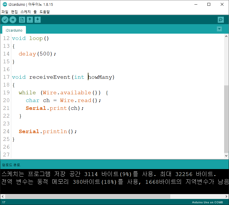 컴파일이 이상없이 완료되면 스케치>업로드(CTRL+U) 를 선택해서 컴파일 파일을 업로드 한다.