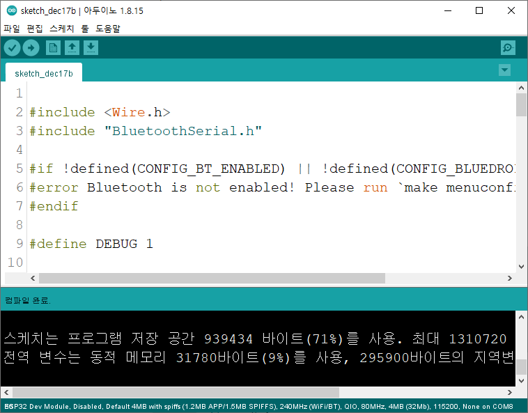스케치>확인/컴파일(CTRL+R) 를 선택해서 컴파일을 진행한다.