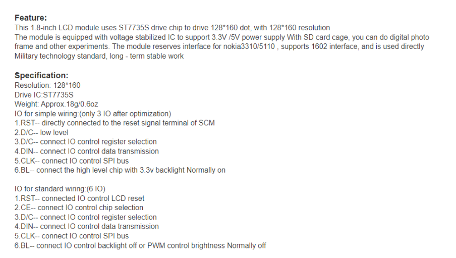ST7735S TFT LCD 특징