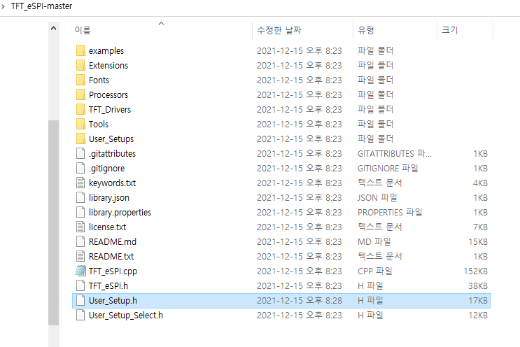 하지만 바로 사용을 할 수 없다. 따라서, User_Setup.h 가 수정된 파일을 복사 한다.