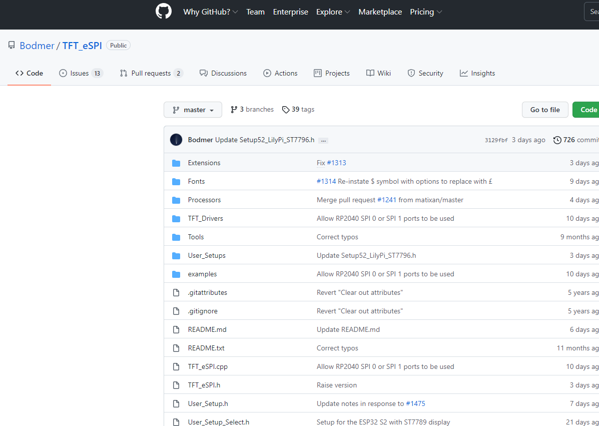 GitHub - Bodmer/TFT_eSPI: Arduino and PlatformIO IDE compatible TFT library optimised for the Raspberry Pi Pico (RP2040), STM32,